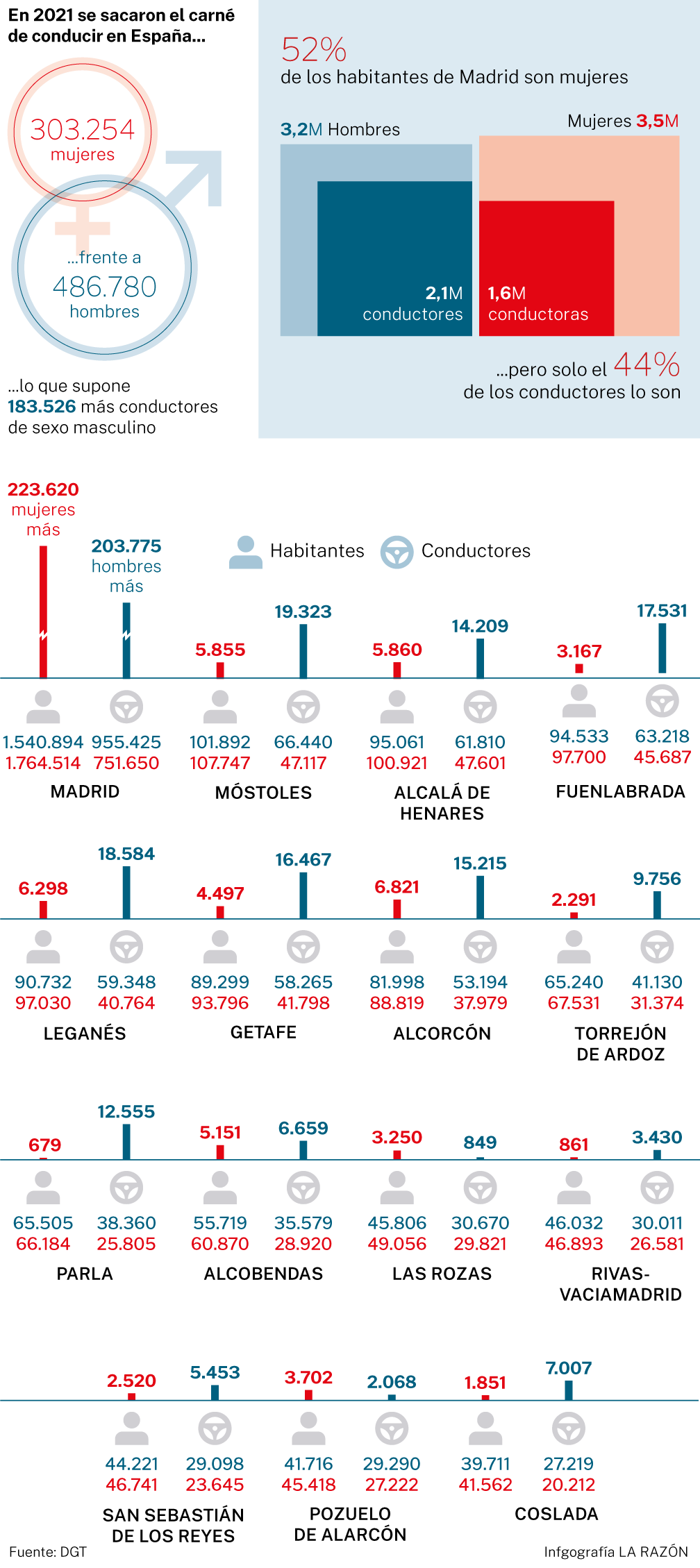 El esquema se repite si detenemos la vista en Madrid capital y los grandes municipios de la región. En todos ellos la población femenina es mayor. En la capital, hay 223.000 mujeres más que hombres, pero hay 203.775 más hombres con el carné de conducir. En Móstoles, 19.323 hombres más; en Alcalá, 14.209; en Fuenlabrada, 17.531; en Leganés, 18.584 en Leganés, en Getafe, 16.467 y en Alcorcón 15.215.