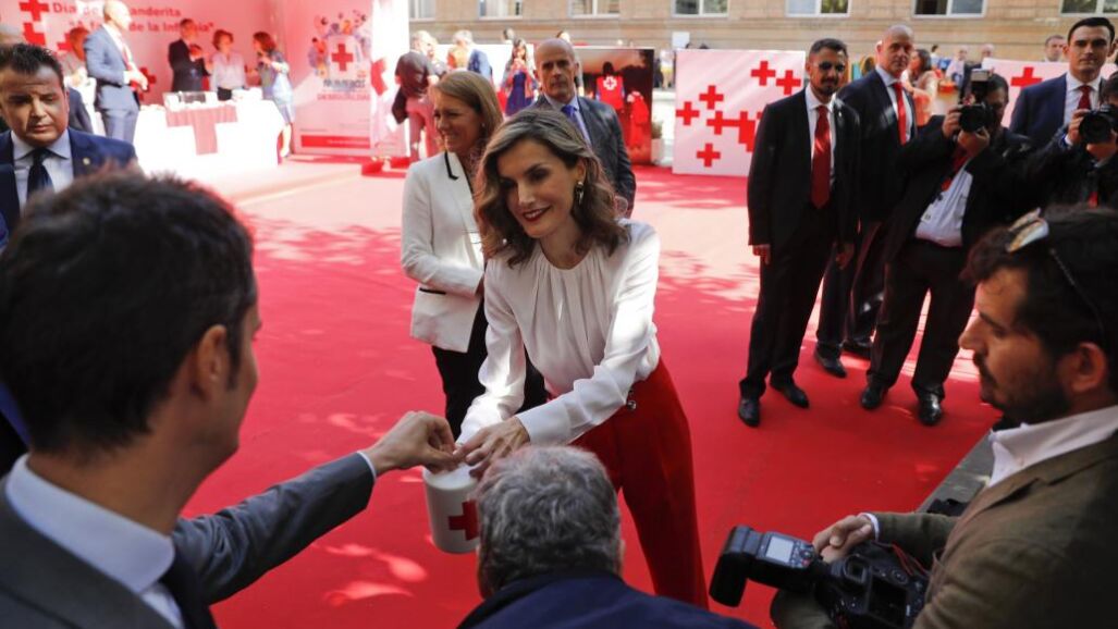 El gesto de Doña Letizia, hoy vestida con los colores de Cruz Roja -blusa blanca y pantalón rojo-, ha causado un pequeño revuelo entre los sorprendidos informadores, que han tenido que dejar a un lado sus cámaras y bolígrafos para buscar en sus bolsillos monedas y billetes que han depositado en la hucha que les ofrecía la Reina.
