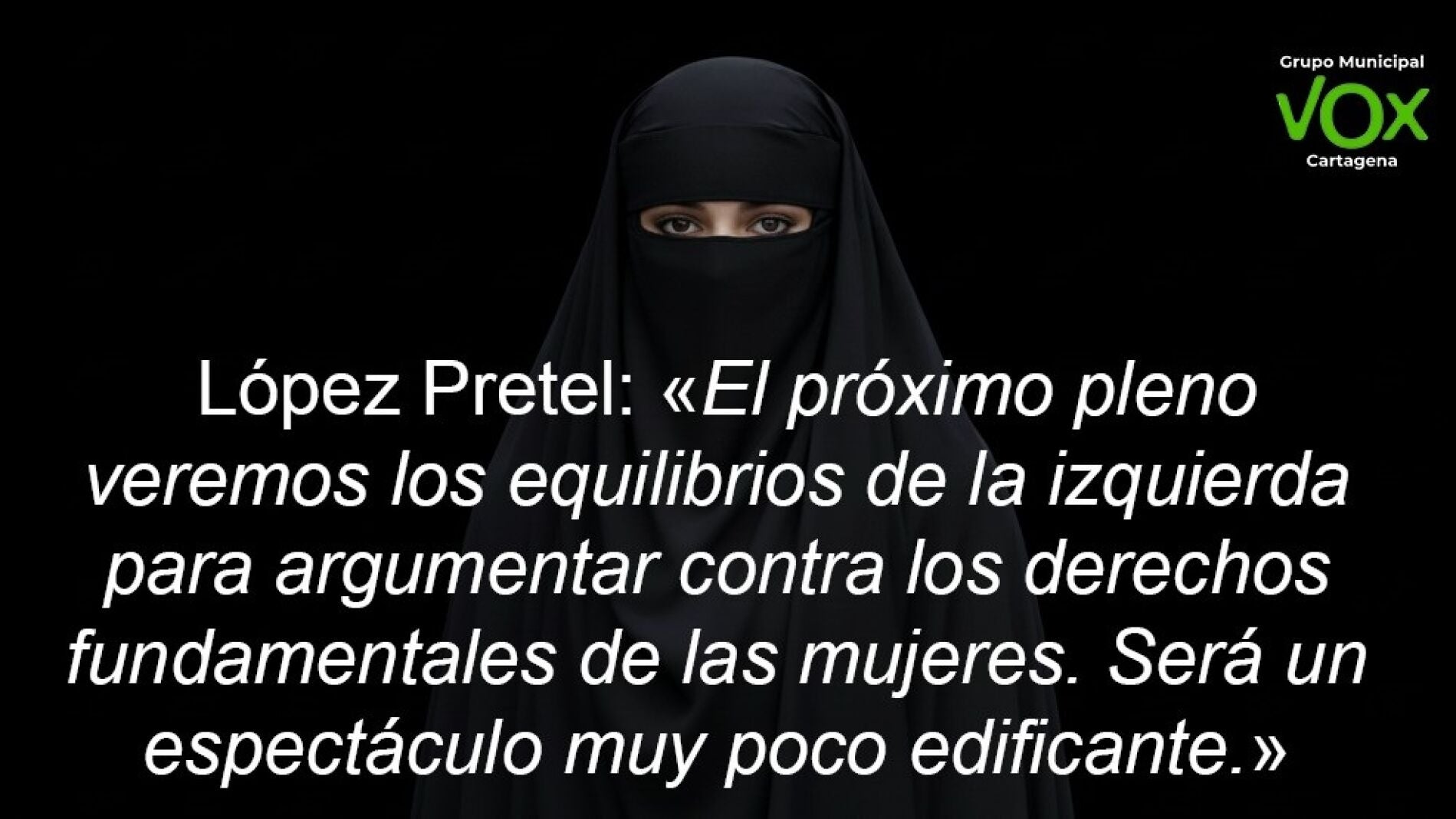 Sobre el uso de estas prendas en los espacios públicos, Pretel añade que "la imposición de prendas como el niqab y el burka es una indignidad, contra la que Vox presentó una iniciativa en el Congreso que ha sido rechazada por toda la izquierda en bloque. Esa izquierda que presume día sí y otro también de feminismo".