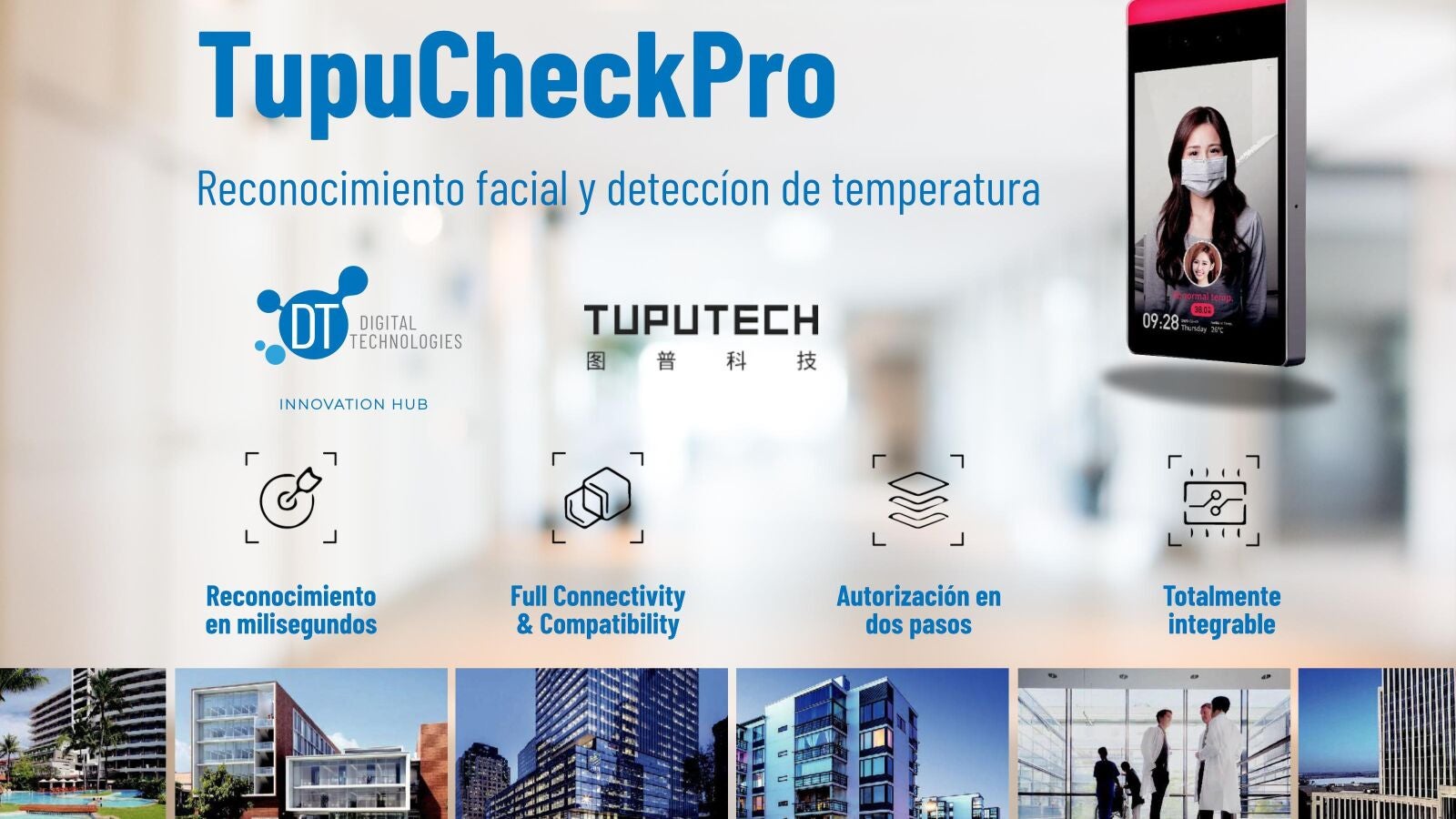 Llega a España de mano de Digital Technologies la solución Tupucheck pro, capaz de realizar termo escaneo en menos de 100 milisegundos y reconocimiento facial en 300 milisegundos que asegure que el usuario porta mascarilla. Esto permitirá garantizar que la entrada a las instalaciones cumplen con las directrices sanitarias