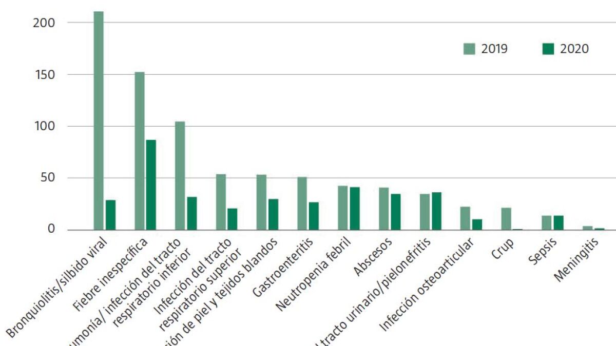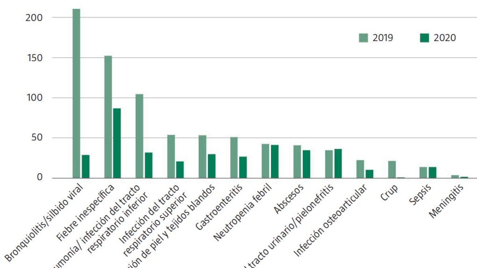 Enfermedades infecciosas respiratorias, gastrointestinales o nosocomiales han visto caer en picado sus cifras en estos meses. Así lo pone de manifiesto un trabajo publicado recientemente en la revista «The Pediatric Infectious Disease Journal» realizado en el Royal Children’s Hospital de Melbourne (Australia), y según el cual entre el 1 de abril y el 31 de mayo de 2020 (periodo en el que las medidas anticoronavirus ya estaban presentes), se produjo una disminución en los ingresos hospitalarios relacionados con infecciones comparado con el mismo lapso de 2019. Según estos datos, en ese tiempo hubo una reducción drástica de 1.264 pacientes en comparación con el mismo período de 2019 a 2005, así comouna bajada proporcional en las admisiones relacionadas con las infecciones del 41% al 30% (818 casos vs 375). En cuanto a las patologías, el descenso más significativo, del 91%, tuvo que ver con el crup o laringotraqueobronquitis (una infección de las vías respiratorias superiores que causa dificultad respiratoria y tos en niños) que pasó de 22 casos a tan sólo dos, seguido del 86% de la bronquiolitis que bajó a 30 casos frente a 212.
