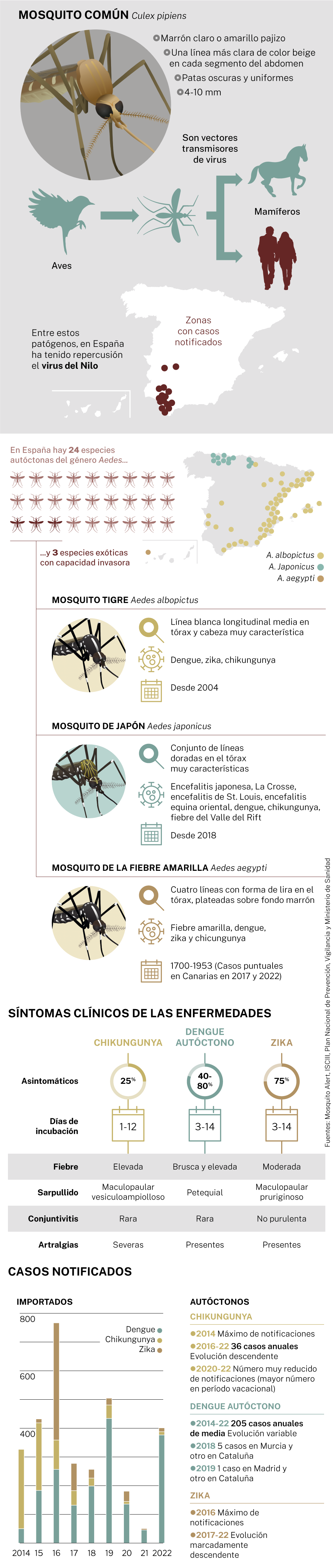 Numerosos mosquitos capaces de transmitir estas enfermedades están presentes y extendidos en gran parte de la geografía española. Tal es el caso del Aedes albopictus, conocido como mosquito tigre que, desde la primera vez que fue visto en 2004 en Barcelona, ha consolidado su presencia en la Península. Esta especie invasora tiene la capacidad de contagiar el dengue, el zika o el chikungunya, por lo que su expansión puede convertirse en un grave problema para la salud pública