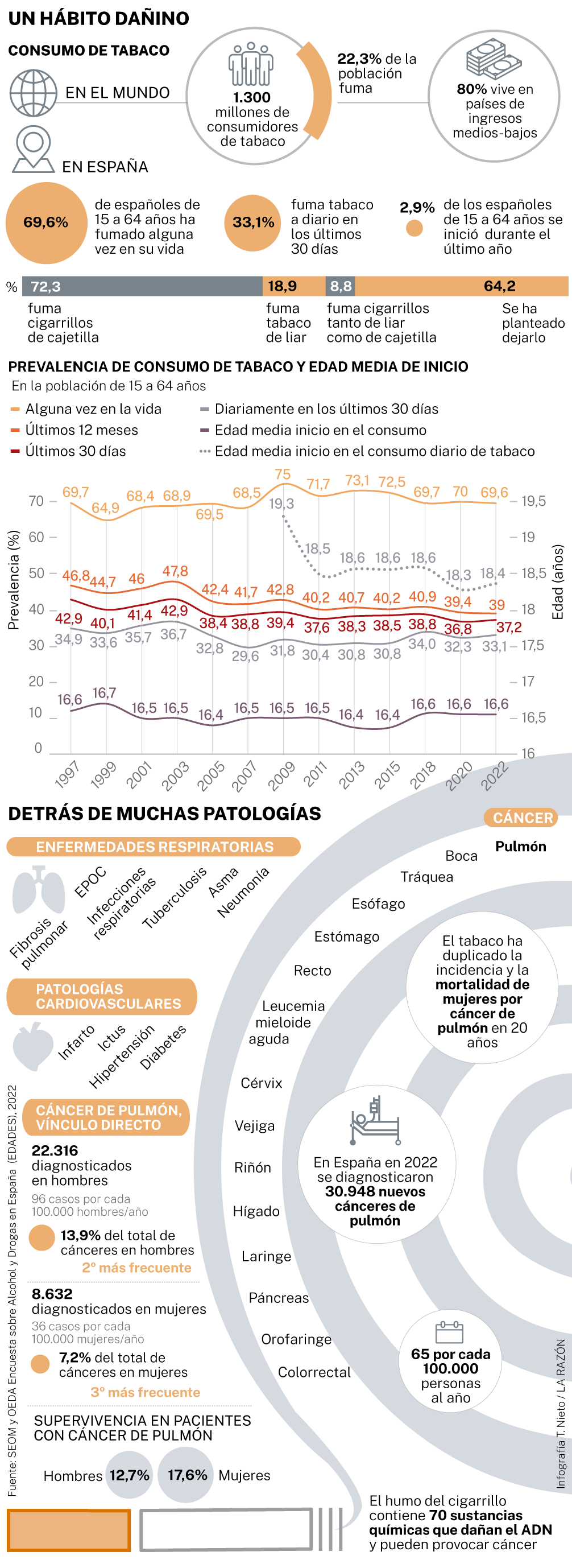 Aunque estos datos resultan rotundos, las estadísticas confirman que el 22,3% de la población mundial fuma, una cifra que resulta incluso mayor en nuestro país, ya que el 33,1% de los españoles consume tabaco a diario, según la última Encuesta sobre Alcohol y otras Drogas en España (Edades 2022). «Duplicamos el consumo de tabaco en comparación con algunos países de nuestro entorno, por lo que resulta urgente actuar. Estamos viendo que en los últimos años se ha producido un estancamiento en la reducción del número de fumadores en nuestro país y no podemos quedarnos impasibles ante eso», alerta Rábade, quien apuesta por «reactivar el plan integral de prevención y control del tabaquismo, que fue consensuado hace dos años por las sociedades científicas, colegios médicos y asociaciones de pacientes, pero que está totalmente estancado por parte del Ministerio de Sanidad».