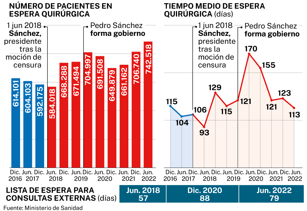 De acuerdo con los datos del Ministerio de Sanidad, dicho tiempo de demora para consultas externas en atención especializada era de 57 días en junio de 2018, cantidad que se elevó a 88 días en diciembre de 2019/enero de 2020. En junio de 2022 se situaba en 79 días. Desde la moción de censura en la que triunfó Sánchez, la espera en este apartado ha subido 22 días, figurando a la cabeza Andalucía, regida por los populares, con 107 días, y Canarias, gobernada por los socialistas, con 101 días. La criticada Madrid figura muy por debajo de la media, con apenas una espera de 51 días. La mejor comunidad en este sentido es el País Vasco, con 29 días.