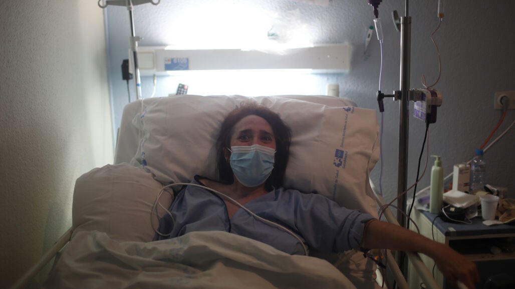 Sin dejar de mirarla un minuto, su marido le arregla el pelo, le estira la sábana. Le dice con cariño que «ahora voy a estar yo». En realidad, siempre estuvo. No se ha separado de ella más de lo estrictamente necesario para teletrabajar y cuidar de su hija Eva: «Sabes que no puedes fallar». Una vez pudo verla en la UCI cuando estaba despierta y recuerda con ojos llorosos lo único que acertó a comprender: «Apenas podía emitir sonidos, era muy frustrante. Solo le entendí que tenía miedo».