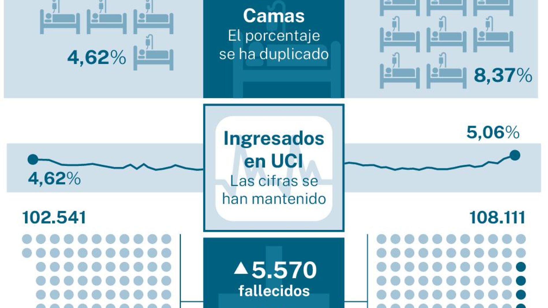 Pero no todas las comunidades con incidencias muy por encima de los mil casos (La Rioja, Extremadura, Canarias y Galicia) están registrando un empeoramiento a la par de sus indicadores hospitalarios. Si ocurre en Madrid, en Cataluña (10,8 %), Castilla-La Mancha (10,4 %), País Vasco (9,6 %), Baleares (9,l %) y Castilla y León (8,9 %), que sufren un empeoramiento de su ocupación hospitalaria global, al tiempo que repunta la incidencia.