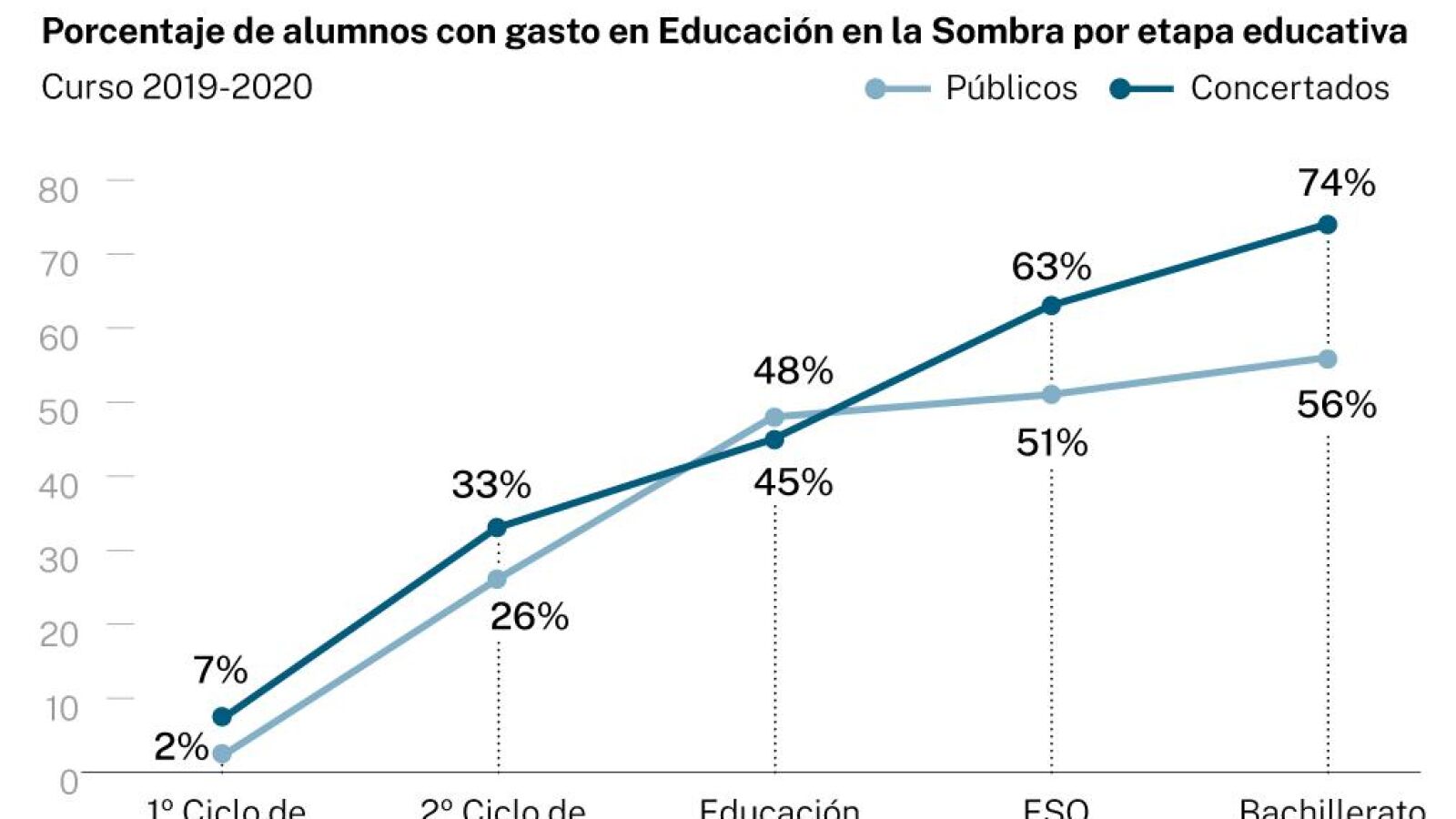 Para hacernos una idea del alcance, el 47% de los alumnos españoles reciben clases particulares. Y más los que van a la escuela privada y concertada (50,1%) que a la pública (46,5%). No obstante, su demanda crece en las etapas más altas: ESO y Bachillerato, en que aumenta la dificultad de las asignaturas (60%), si bien es cierto que los idiomas concentran el 46% del gasto en clases particulares y son la prioridad número uno en el gasto de las familias españolas en «educación en la sombra», según revela el estudio. «Cuantos más recursos tiene una familia, más gasta en clases. Los padres que llevan a sus hijos a un centro privado desembolsan hasta tres veces más que los que escolarizan a sus hijos en escuelas públicas. Y esto tiene que ver con el hecho de que cada vez hay mayor conciencia de que sus vástagos van a tener que vivir en un entorno cada vez más competitivo y que cuando acaben sus estudios van a encontrar un mercado de trabajo hostil. En esa competición, las familias están dispuestas a invertir lo que haga falta», explica Juan Manuel Moreno, catedrático de Didáctica y Organización Escolar de la UNED y Senior Policy Felow de Educación en EsadeEcPol.