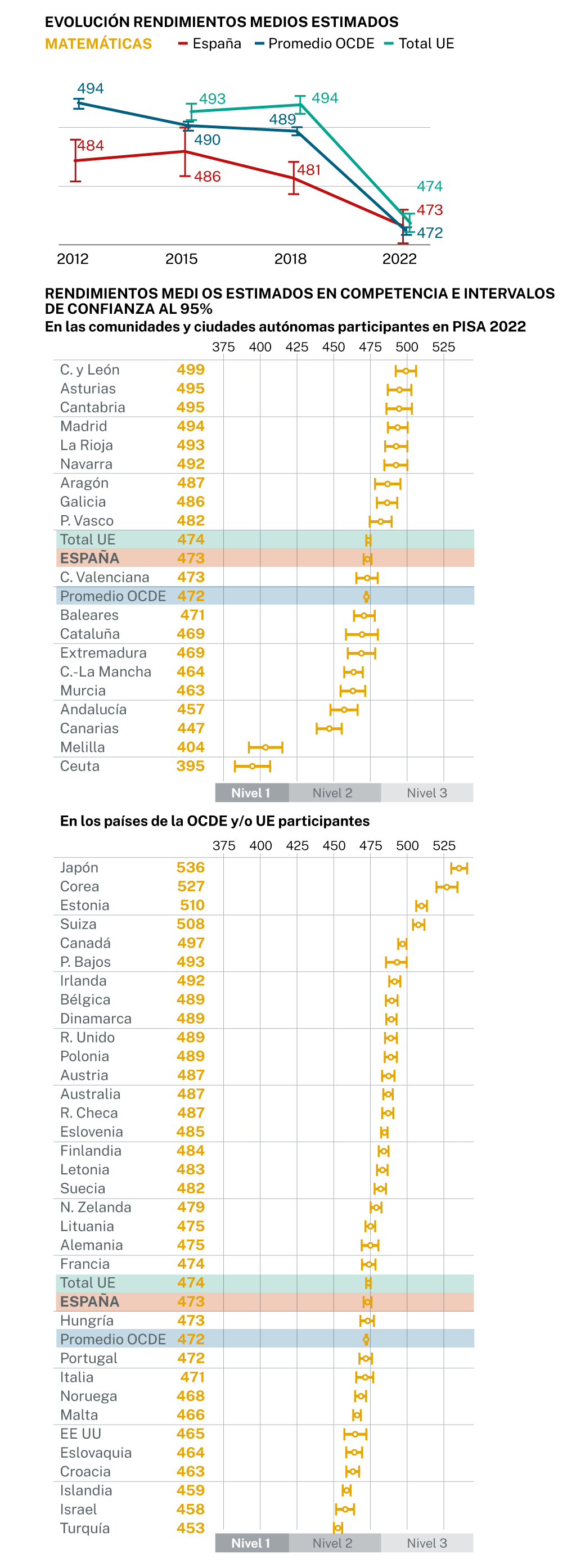 El estudio constata que este bajón es generalizado, aunque la buena noticia es que en España ha sido menor que en otros países de la OCDE. El rendimiento medio del alumnado español en matemáticas se sitúa en los 473 puntos, una cifra similar a la media OCDE (472) y al total de la Unión Europea (474), lo que nos sitúa en niveles de países como Hungría, Francia, Alemania, Portugal o Italia. También pone de relieve que tenemos una cifra de alumnos excelentes muy baja: solo representan el 6%.