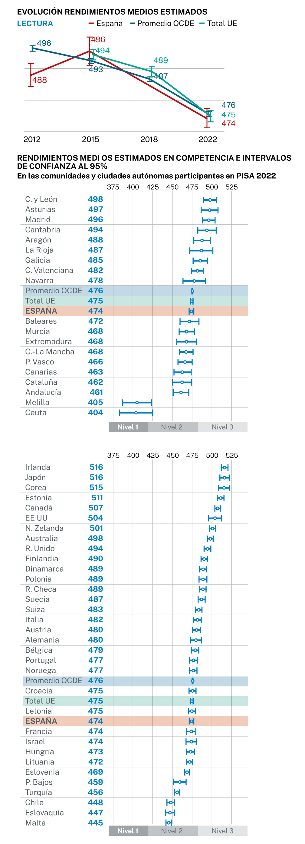 En cuanto a la competencia lectora, fundamental para poder abordar otras asignaturas con éxito, las cosas tampoco son mejores. España, con 474 puntos, se encuentra ligeramente por debajo de la media de la OCDE (476) y el total UE (475). En este caso, los resultados caen 14 puntos respecto a 2012 en España, cuando en el conjunto de la OCDE bajan 21 puntos.