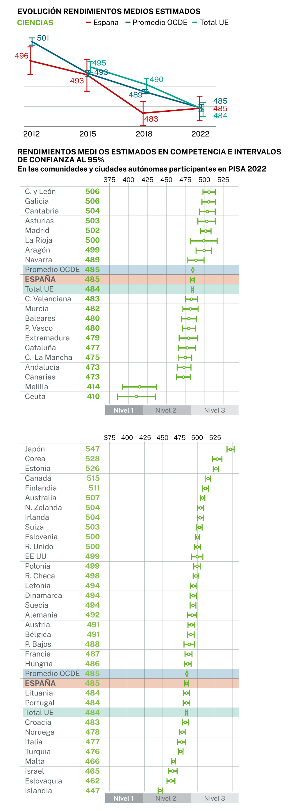 En el caso de la competencia en ciencias, el alumnado español obtiene 485 puntos (la media OCDE se sitúa en 485 y el total UE en 484), dos puntos más que en 2018, pero es que ese año España ya sufrió el mayor descalabro de su historia desde que se evalúa esta materia. Si ampliamos la perspectiva, respecto a 2012, el rendimiento cae 11 puntos en la media de España y 16 puntos en la media OCDE.