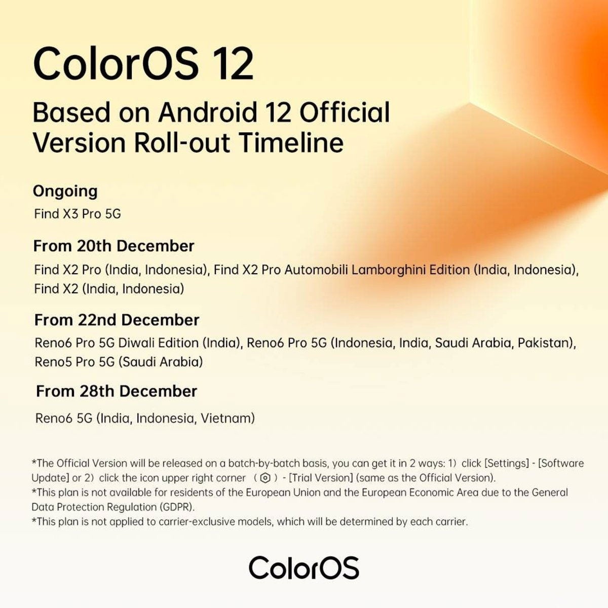 En las imágenes que acompañan al citado tweet, las cuales os dejamos bajo estas líneas, podemos observar que ColorOS 12 con Android 12 irá llegando a los diferentes modelos de la firma china a lo largo de mes de diciembre y a una serie de regiones en concreto.