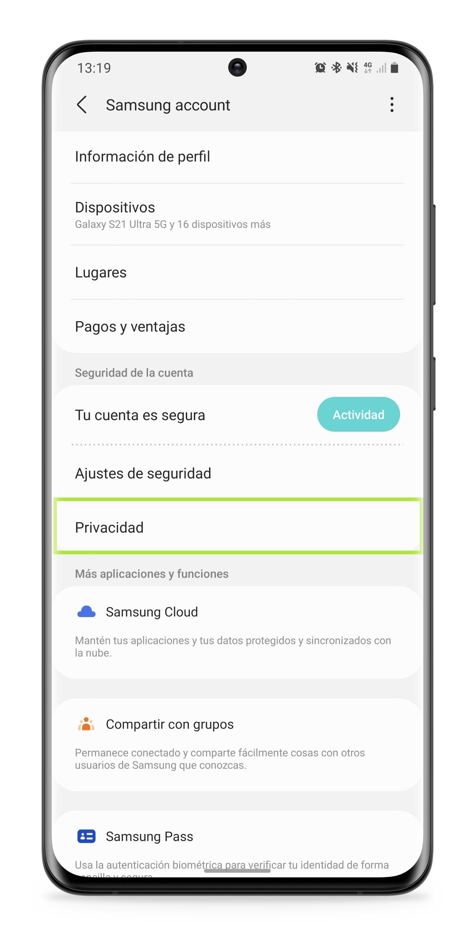 - Abre los ajustes de tu móvil y toca sobre tu nombre de usuario para acceder a los ajustes de tu cuenta de Samsung.