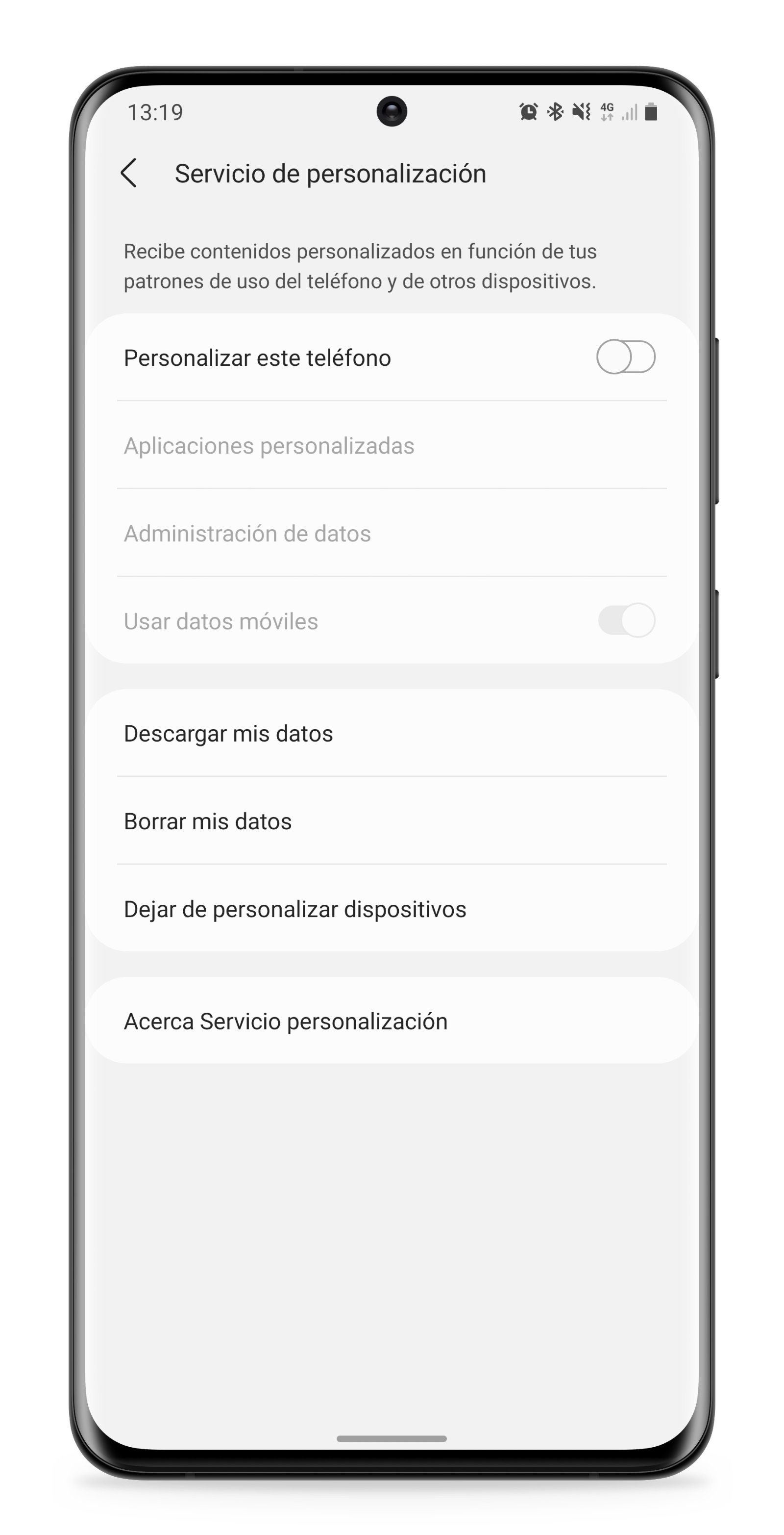 Desde el apartado de "Servicios de personalización" también puedes descargar los datos que Samsung ha recopilado sobre ti, así como eliminarlos por completo. Por último, también puedes establecer que la firma deje de recopilar datos en todos los dispositivos que tienes vinculados a tu cuenta Samsung.