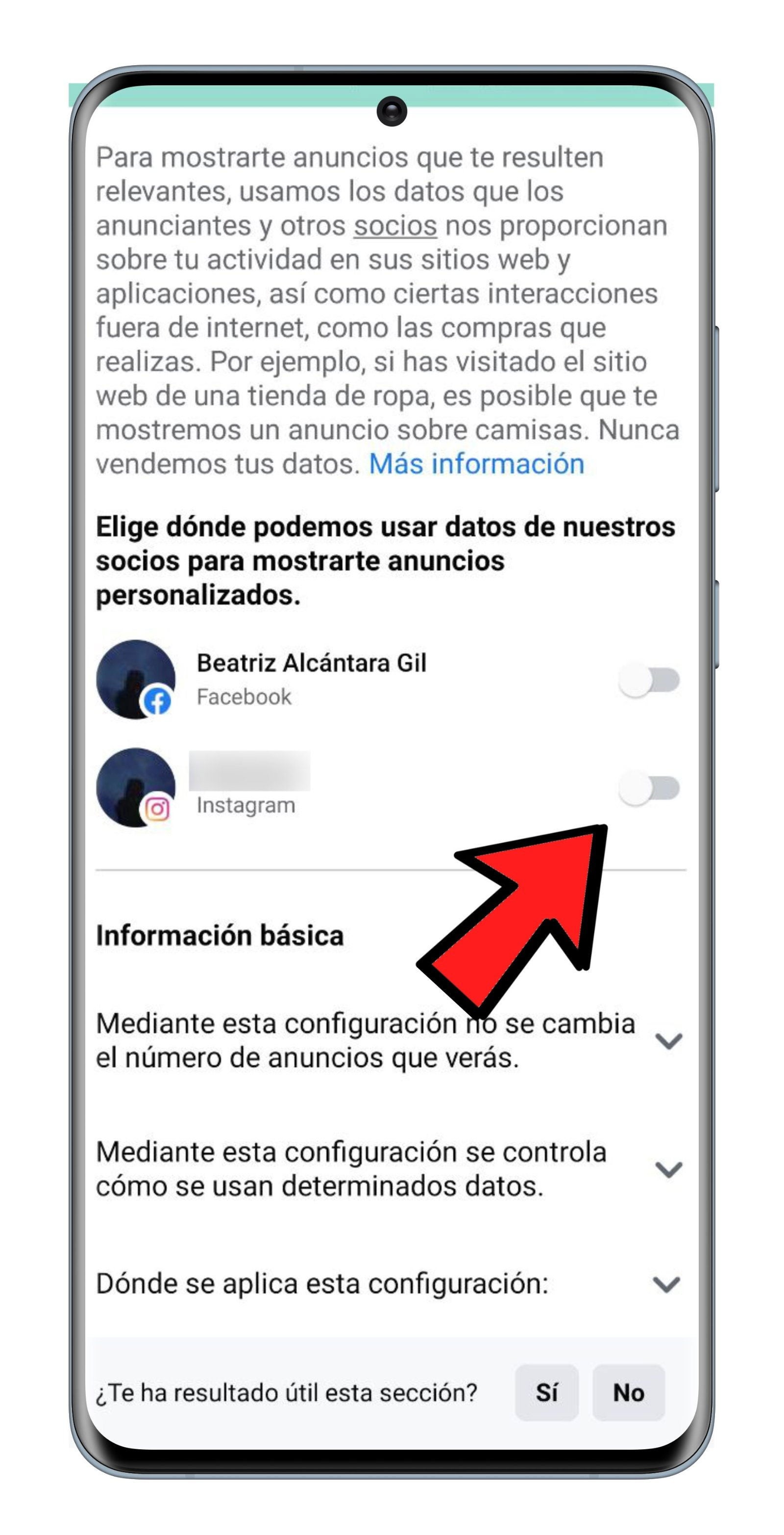 - Accede al apartado "Datos de socios sobre tu actividad" y desactiva todas tus cuentas para que Facebook no pueda tomar datos de ellas para mostrarte anuncios personalizados.