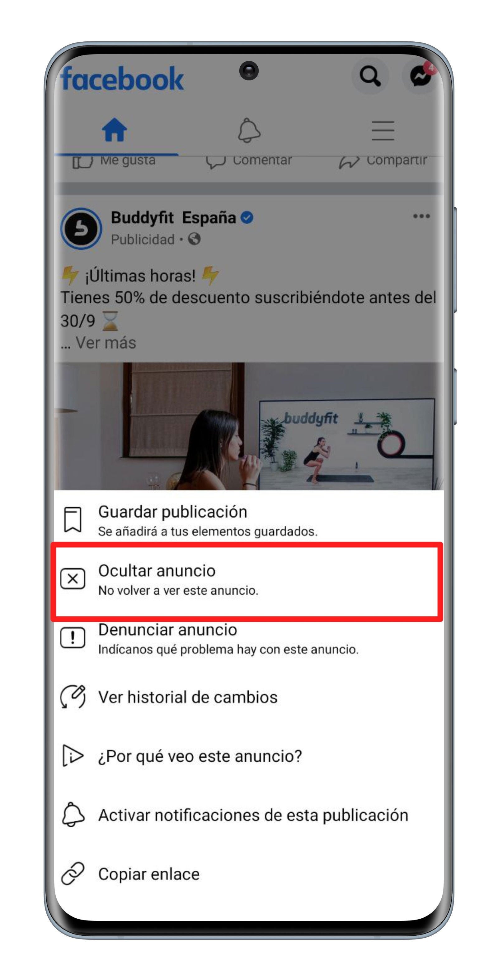 - En el menú de opciones, selecciona "Ocultar anuncio".