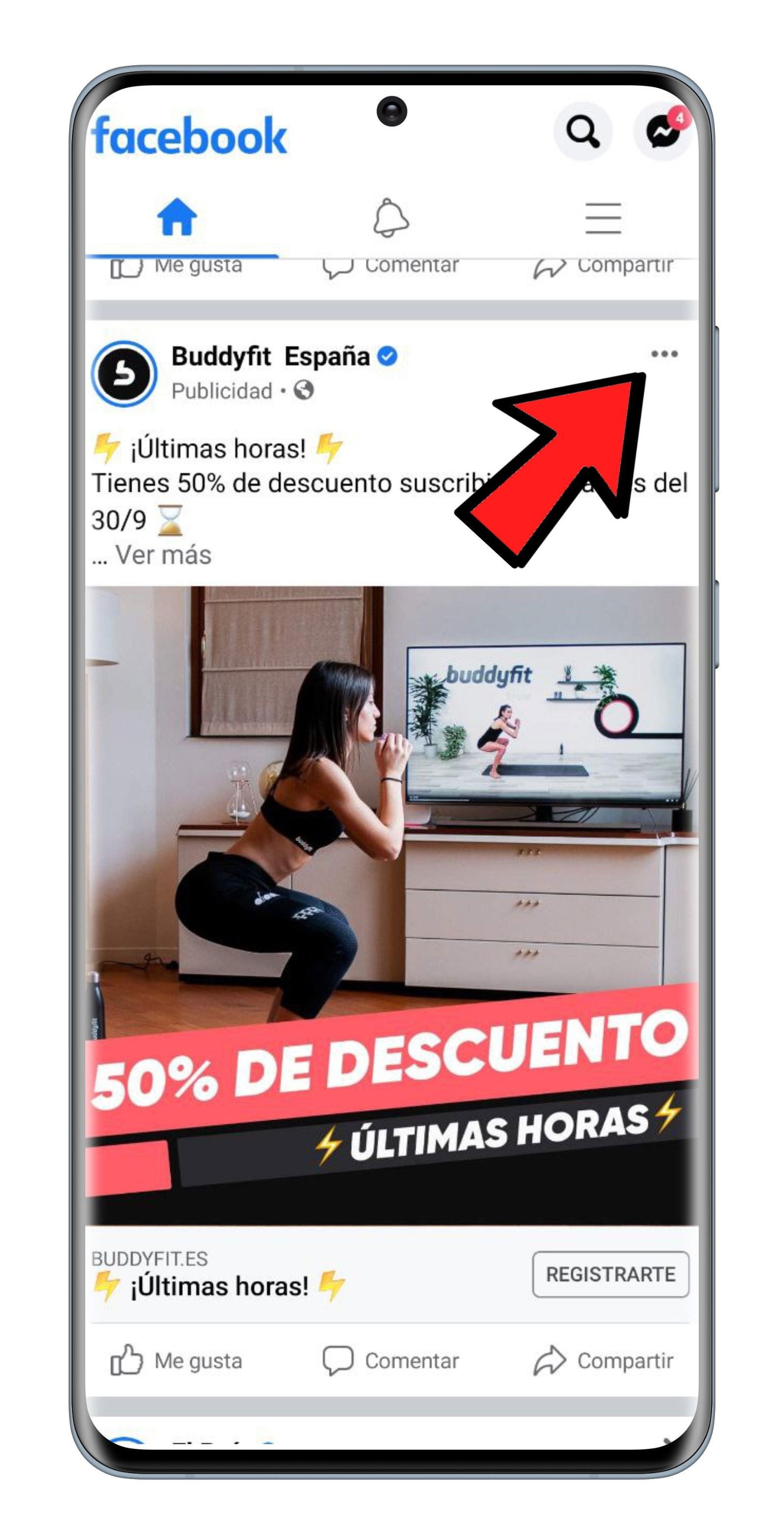 - Pincha en el botón de tres puntos que aparece en la esquina superior derecha del anuncio.