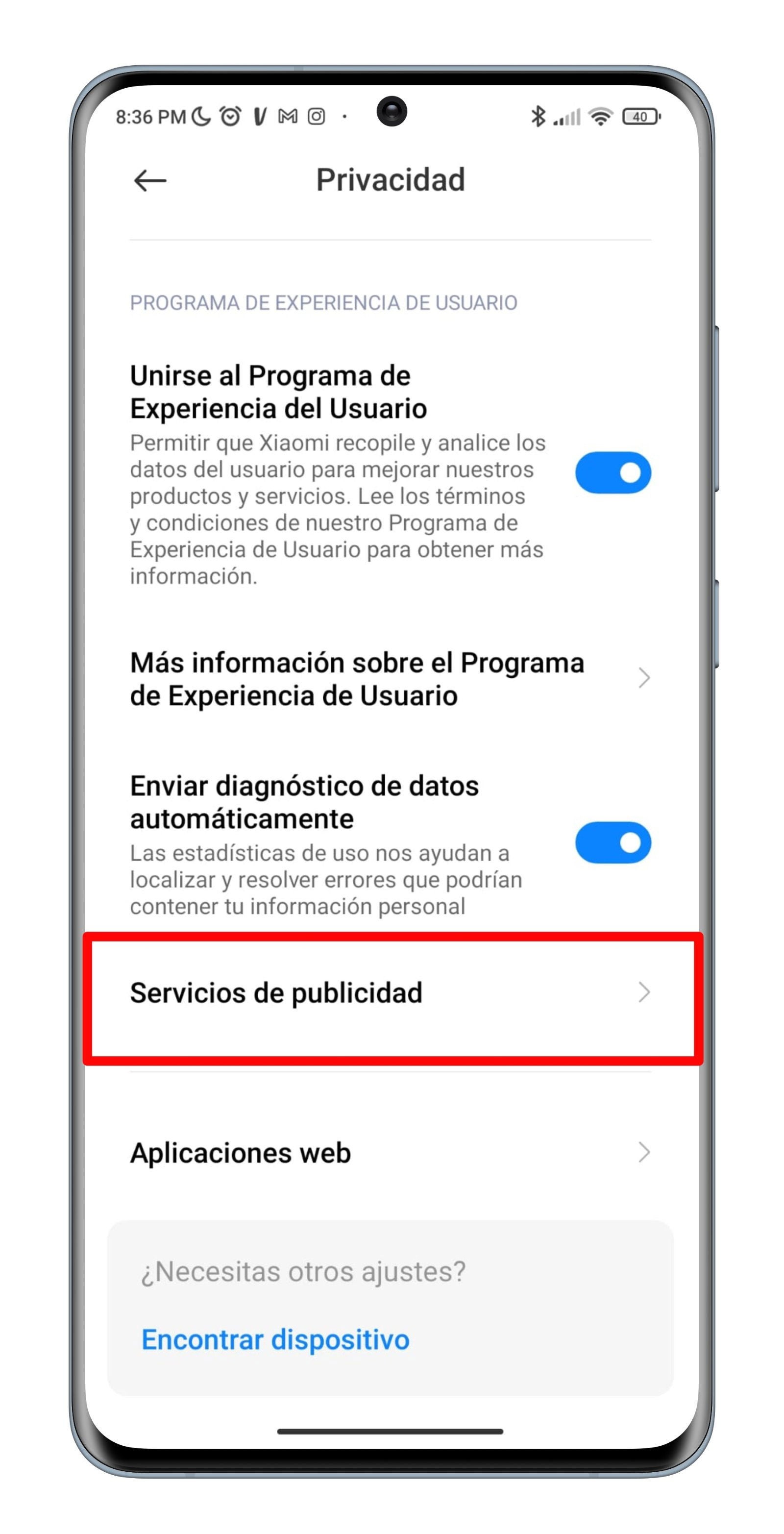 - Desliza hacia abajo y entra en "Servicios de publicidad".