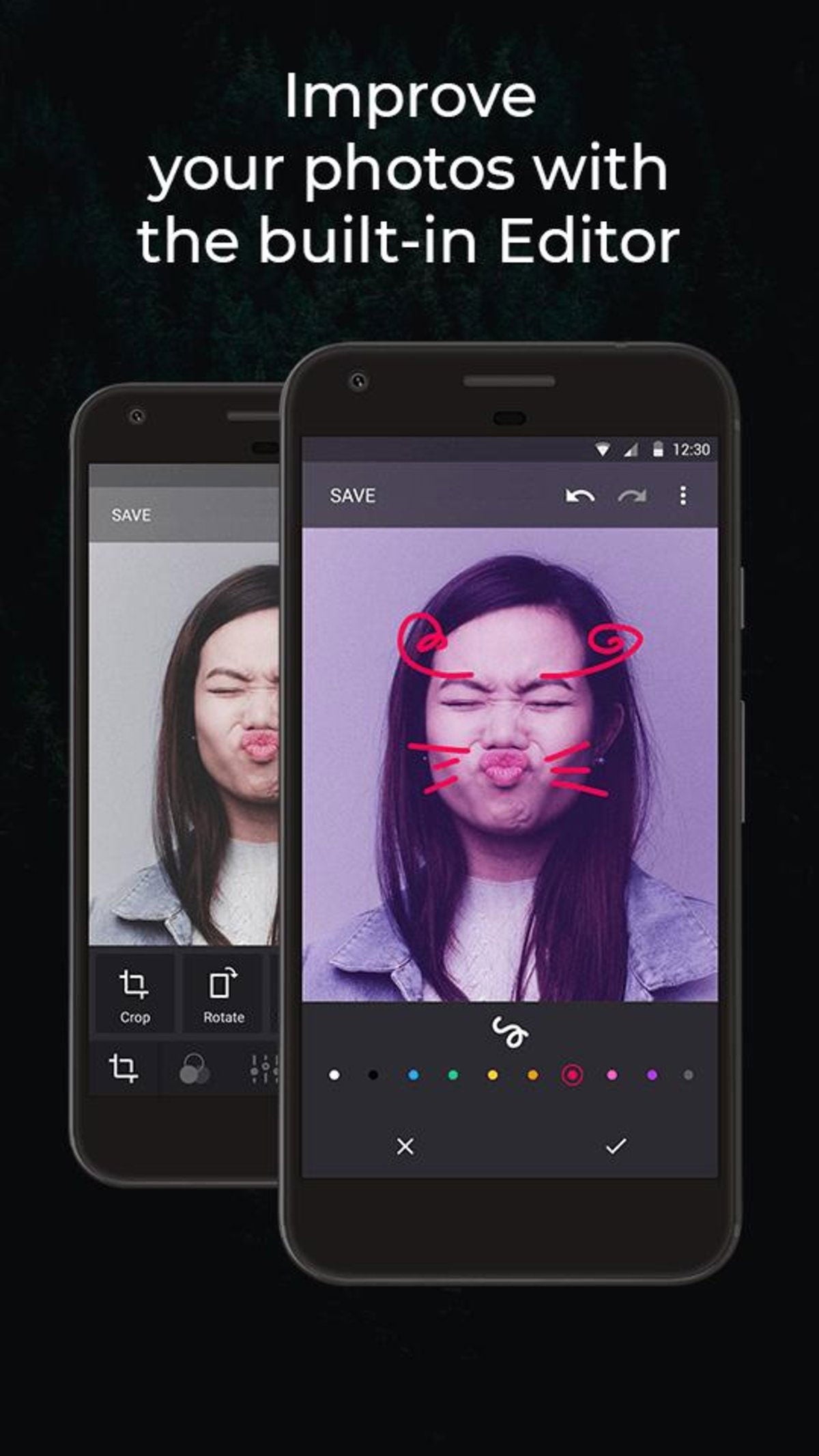 Incluye, además, con un editor de fotos integrado con el que podrás retocar las imágenes sin salir de la app.