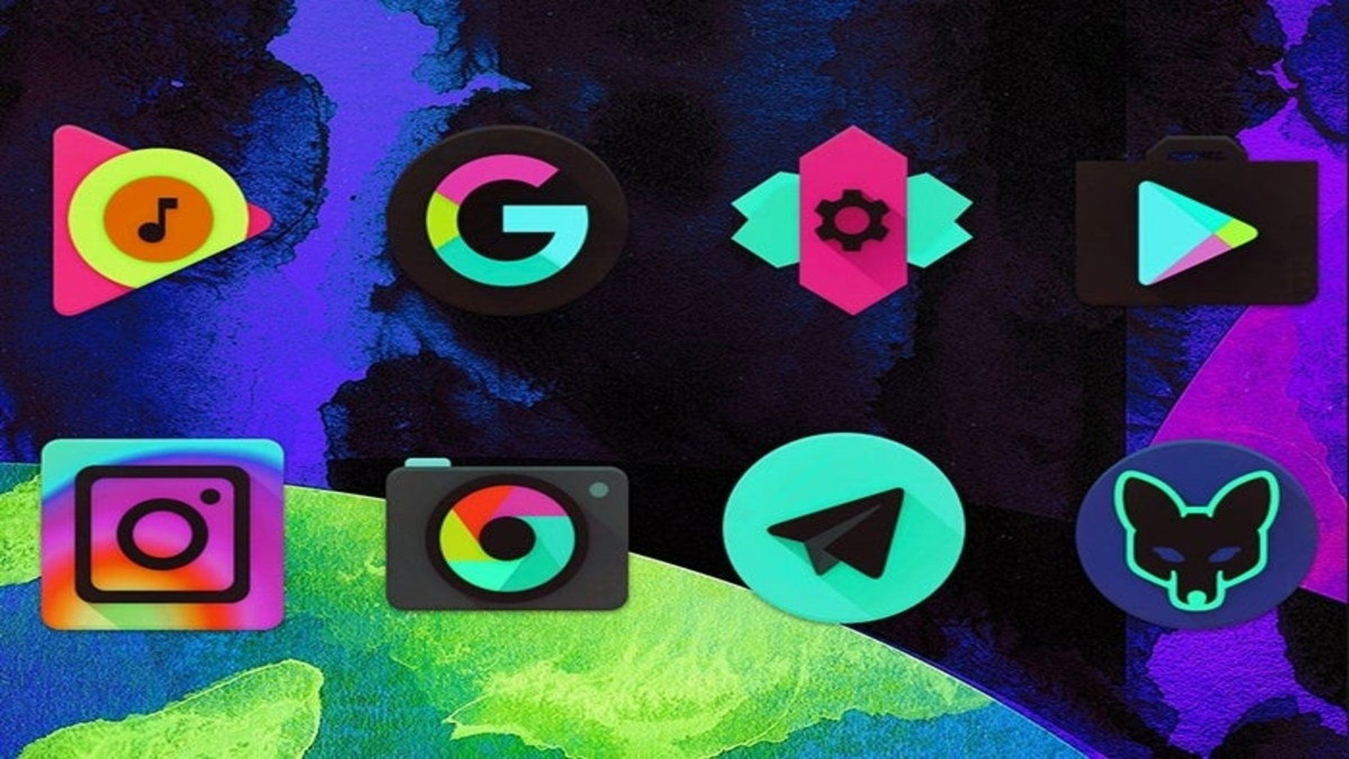 Iconos que siguen las líneas de diseño Material Design, mezclando tonos oscuros y colores vivos. Además de los iconos, incluye más de 200 fondos de pantalla almacenados en la nube.