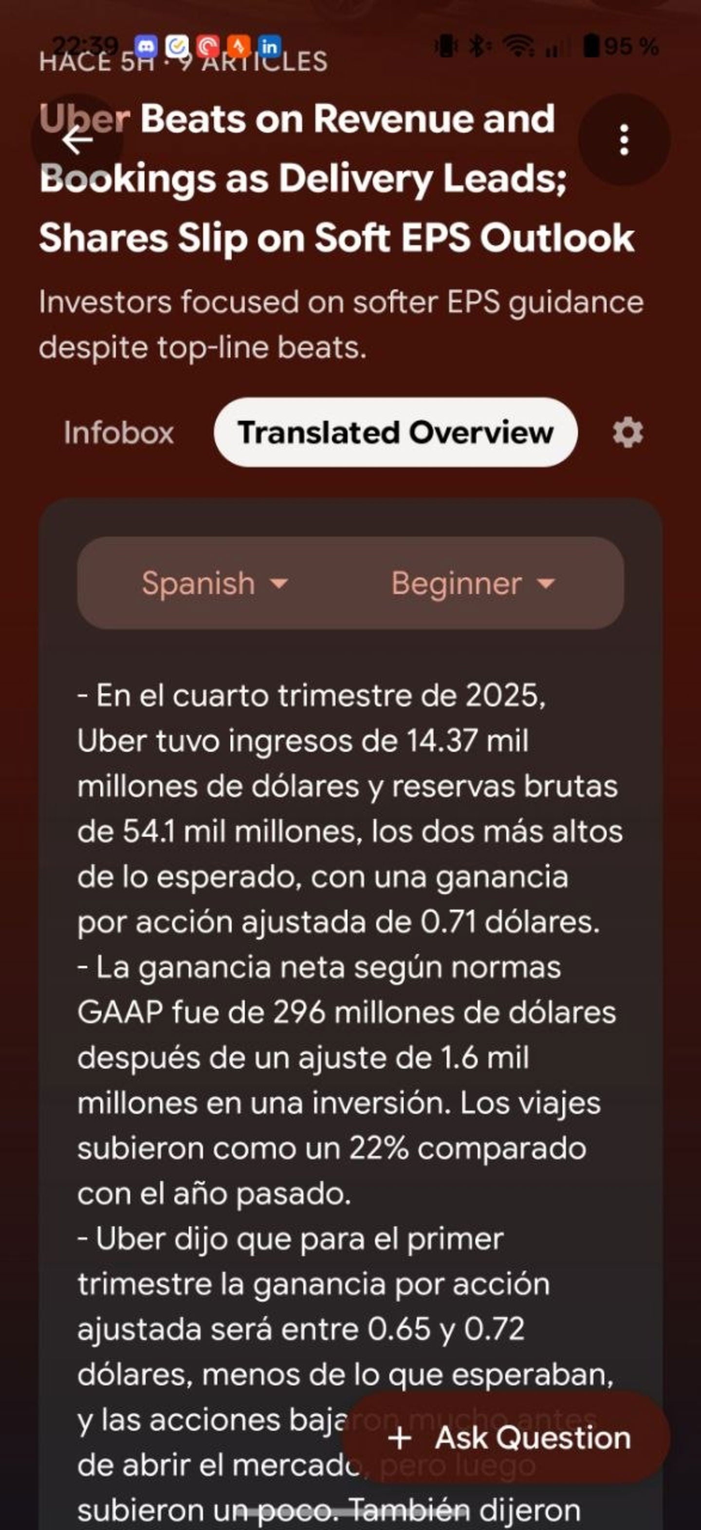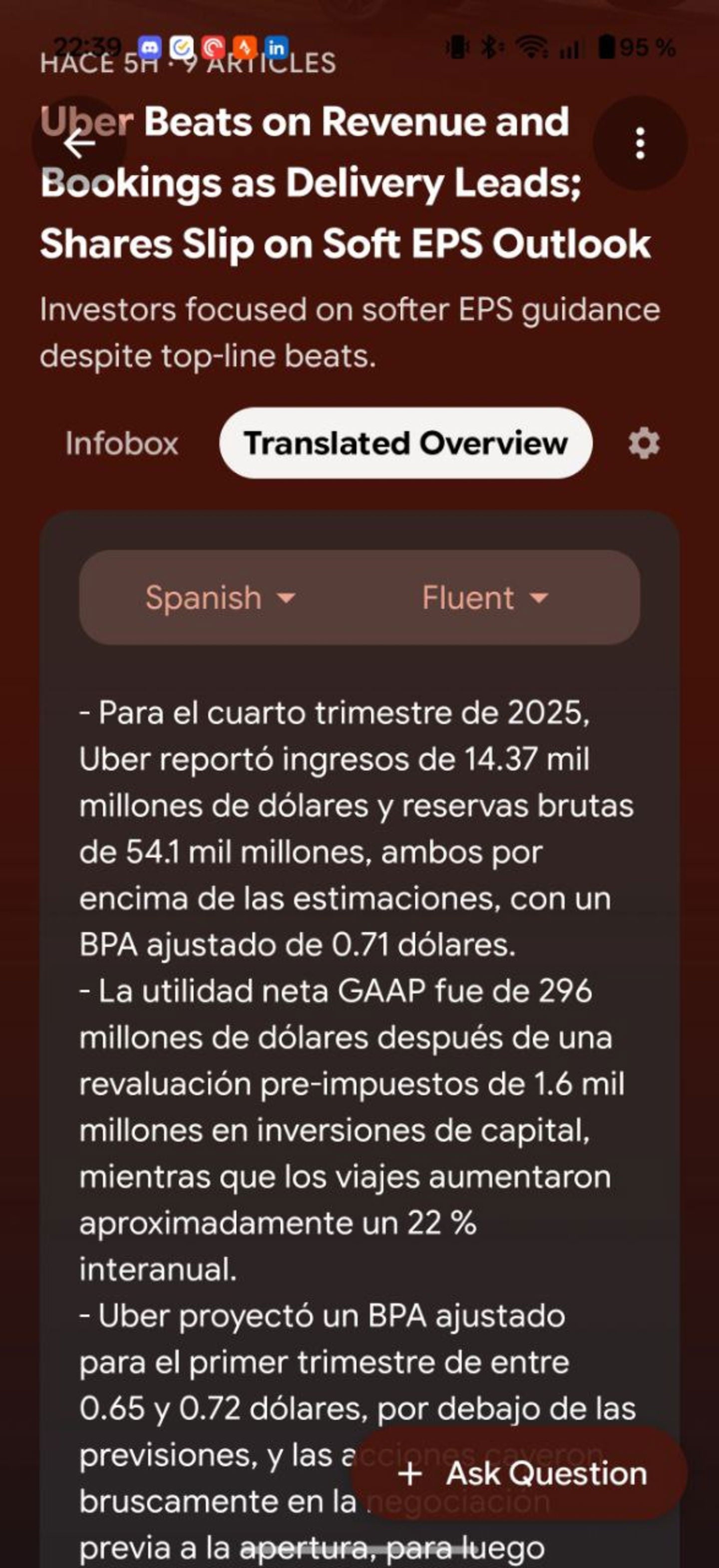 Además, otro detalle que me encanta de 'Particle News' es que, aunque esta aplicación está únicamente en inglés, al entrar en una noticia tienes una barra en la parte superior justo debajo del titular y el subtitular con varias opciones y una de ellas se llama "Translated Overview" y te muestra una traducción al español del resumen de todos los artículos recopilados, la cual puedes personalizar un poco escogiendo entre un tono más simple denominado 'beginner' y otro más profesional llamado 'fluent'.
