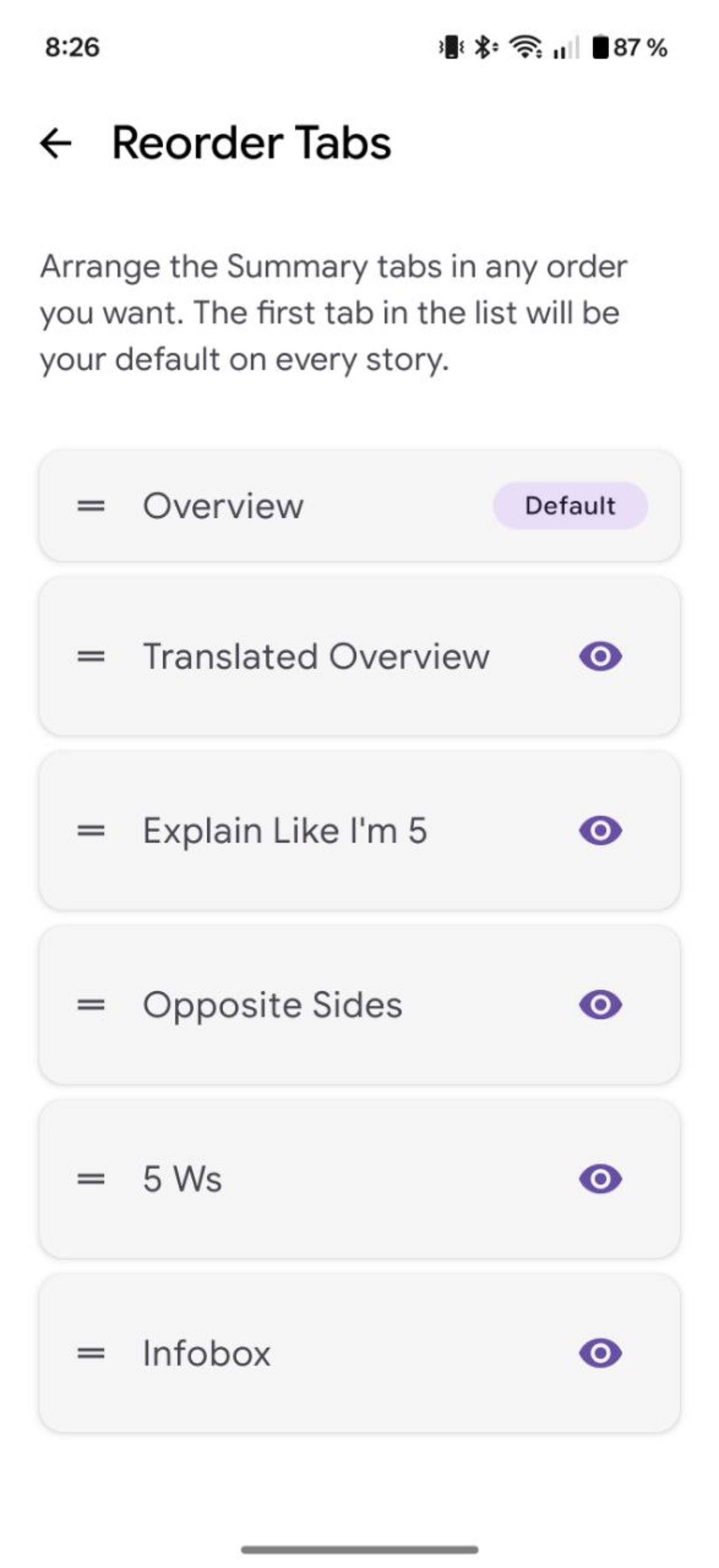 Asimismo, aunque 'Particle News' reconoce automáticamente el idioma de tu terminal para realizar las traducciones, vas a poder escoger cualquier otro idioma tocando en el menú desplegable y si accedes a la configuración de esta app podrás mover las diferentes opciones que se muestran en cada "noticia", algo que me ha resultado realmente útil, puesto que me ha permitido colocar la opción "Translated Overview" en la parte izquierda justo al lado de la pestaña "Overview".