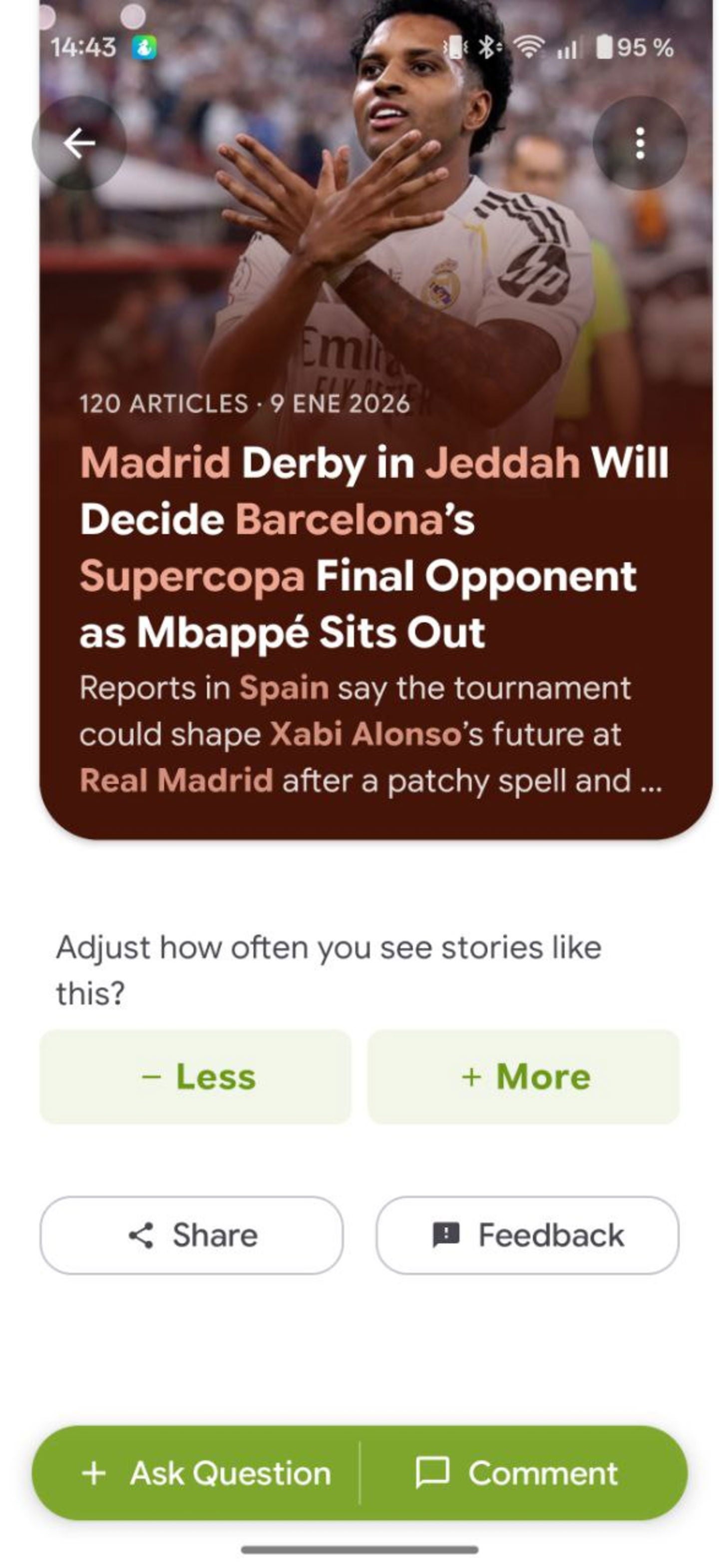 Por otra parte, cuando entras en una "noticia", en la parte inferior puedes acceder a todos los artículos que se han usado para generar el resumen y también valorar si te ha gustado más o menos usando los botones "- Less" y "+ More" para que el algoritmo de IA te recomiende temas que van acorde con tus preferencias.