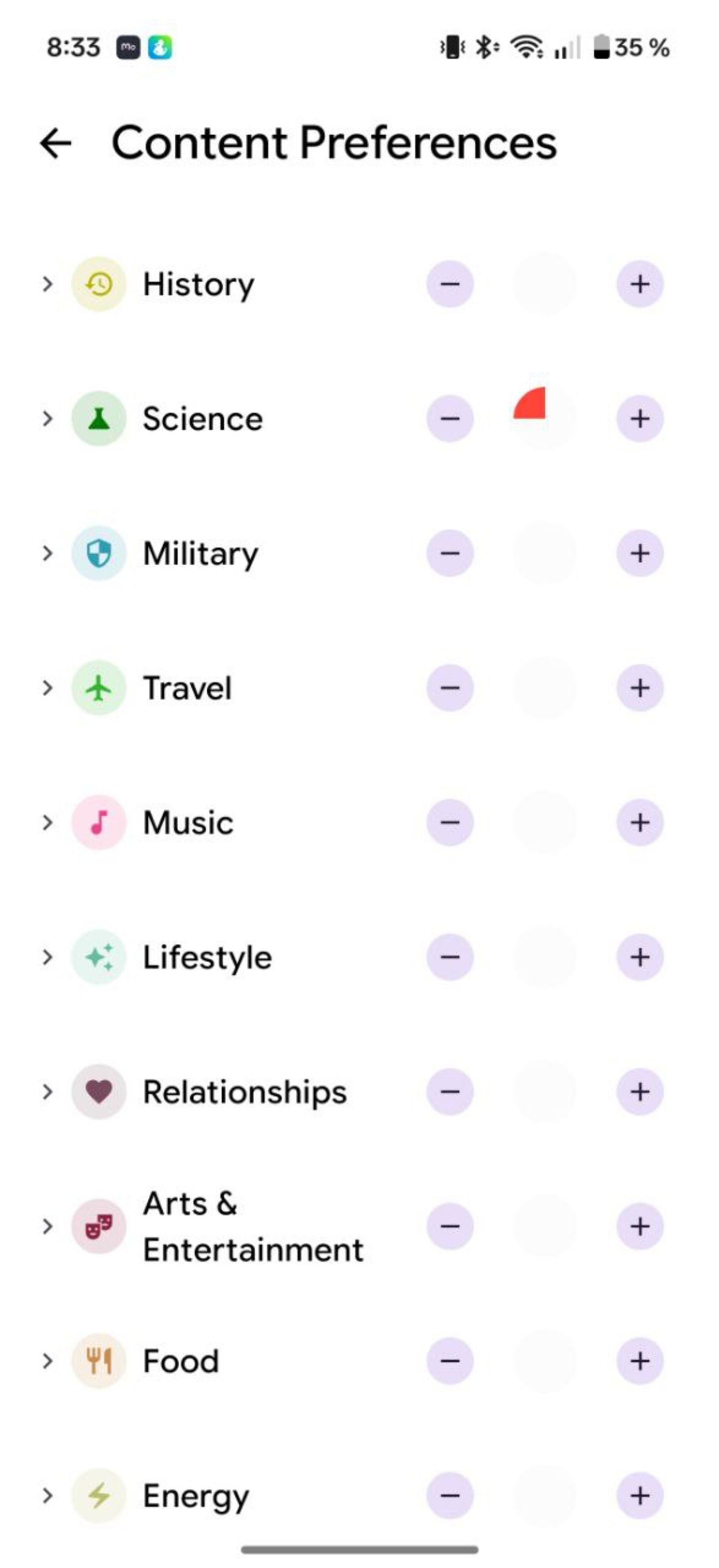 Una vez creada la cuenta, la aplicación te mostrará 7 noticias tipo para que tú indiques cuáles te gustan más o menos pulsando en los botones "- Less" y "+ More" que aparecen en la parte inferior.
