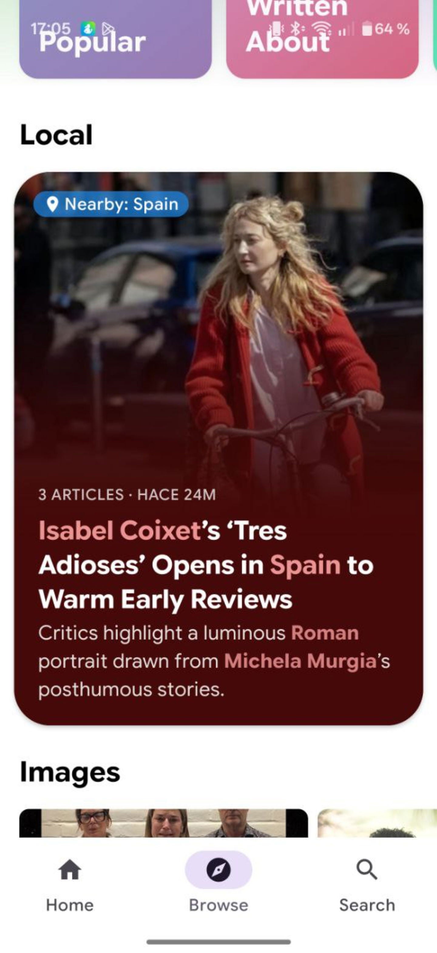 La simplicidad de 'Particle News' también se aprecia en su interfaz de usuario, puesto que la app se organiza en 3 pestañas principales: Home, Browse y Search. Así, en la pestaña "Home" te irán apareciendo noticias que sean de tu interés organizadas por categorías, desde la pestaña "Browse" podrás acceder a las noticias de medios de tu país y a otros contenidos más visuales como imágenes o vídeos y en la pestaña "Search", tal como nombre indicas, podrás buscar noticias relacionadas con un tema en concreto.