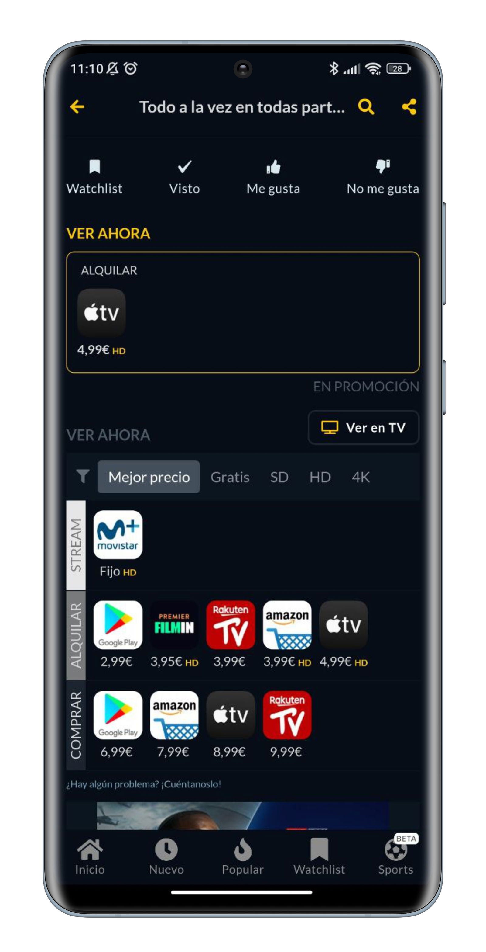 Por último, también utilizo esta aplicación para ahorrar tiempo a la hora de ver una nueva serie o película. ¿Cómo? Busco el nombre de la película, compruebo si está en alguna plataforma a la que estoy suscrita y, si es así, la envío directamente a la smart TV para que comience la reproducción automáticamente. Esto es posible gracias a la función "Ver en TV", que encontrarás en forma de botón al lado del apartado "Ver ahora".