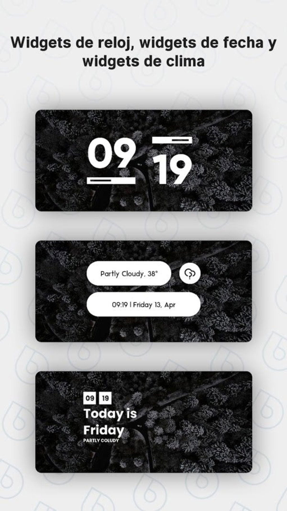 Todo ello se combina con un útil widget del tiempo con diferentes estilos a elegir. Entre la colección de widgets, encontramos widget de reloj y clima, previsión meteorológica semanal, pronóstico del tiempo a 14 días o widget para el clima actual.
