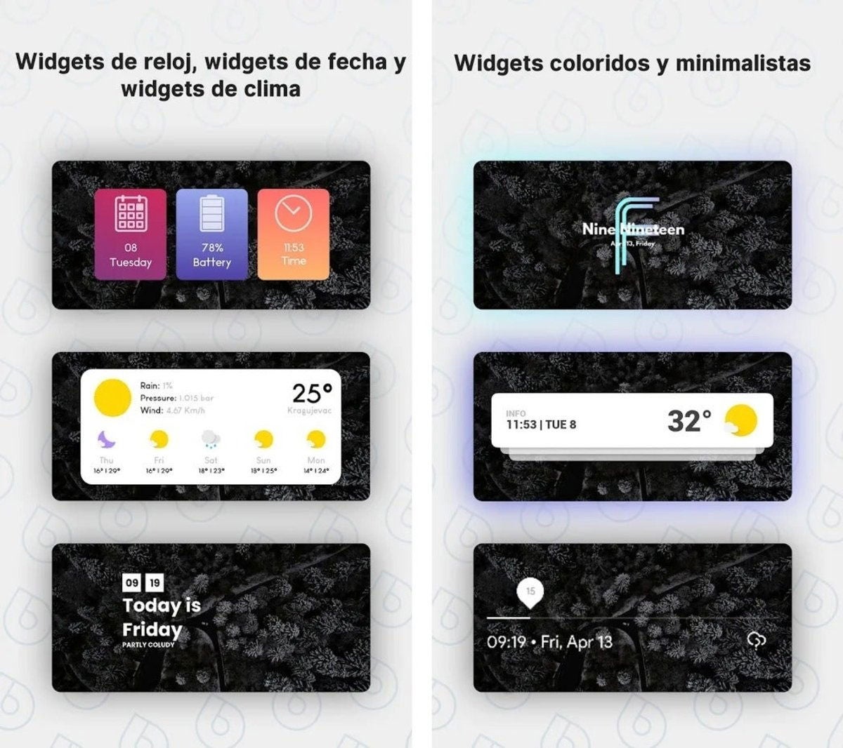 Overdrop cuenta con widgets de todos los estilos y para todos los gustos, con diseños minimalistas, coloridos, simples, así como algunos inspirados en otros widgets populares como el widget del tiempo de los Google Pixel.