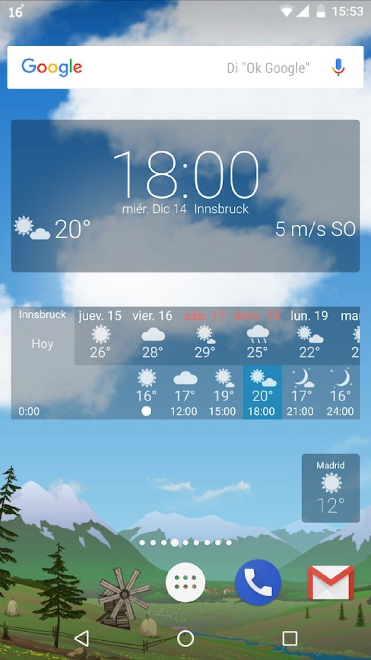 Probablemente, una de las apps del tiempo más famosas que existen. AccuWeather no solo es una app para consultar el estado de lo más completa. También incluye widgets de diferentes estilos, que pueden ser personalizados para consultar el pronóstico del tiempo de la manera más visual posible.