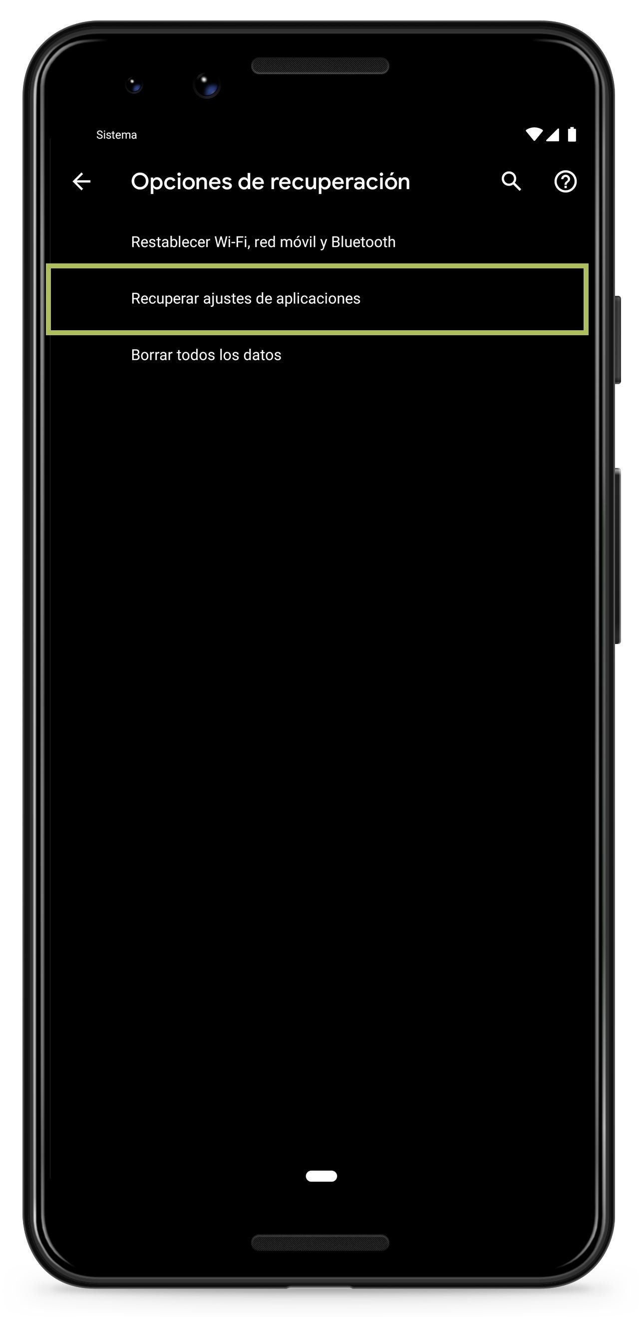- Seleccionar la opción "Recuperar ajustes de aplicaciones" y pulsar sobre el botón "Restablecer aplicaciones".