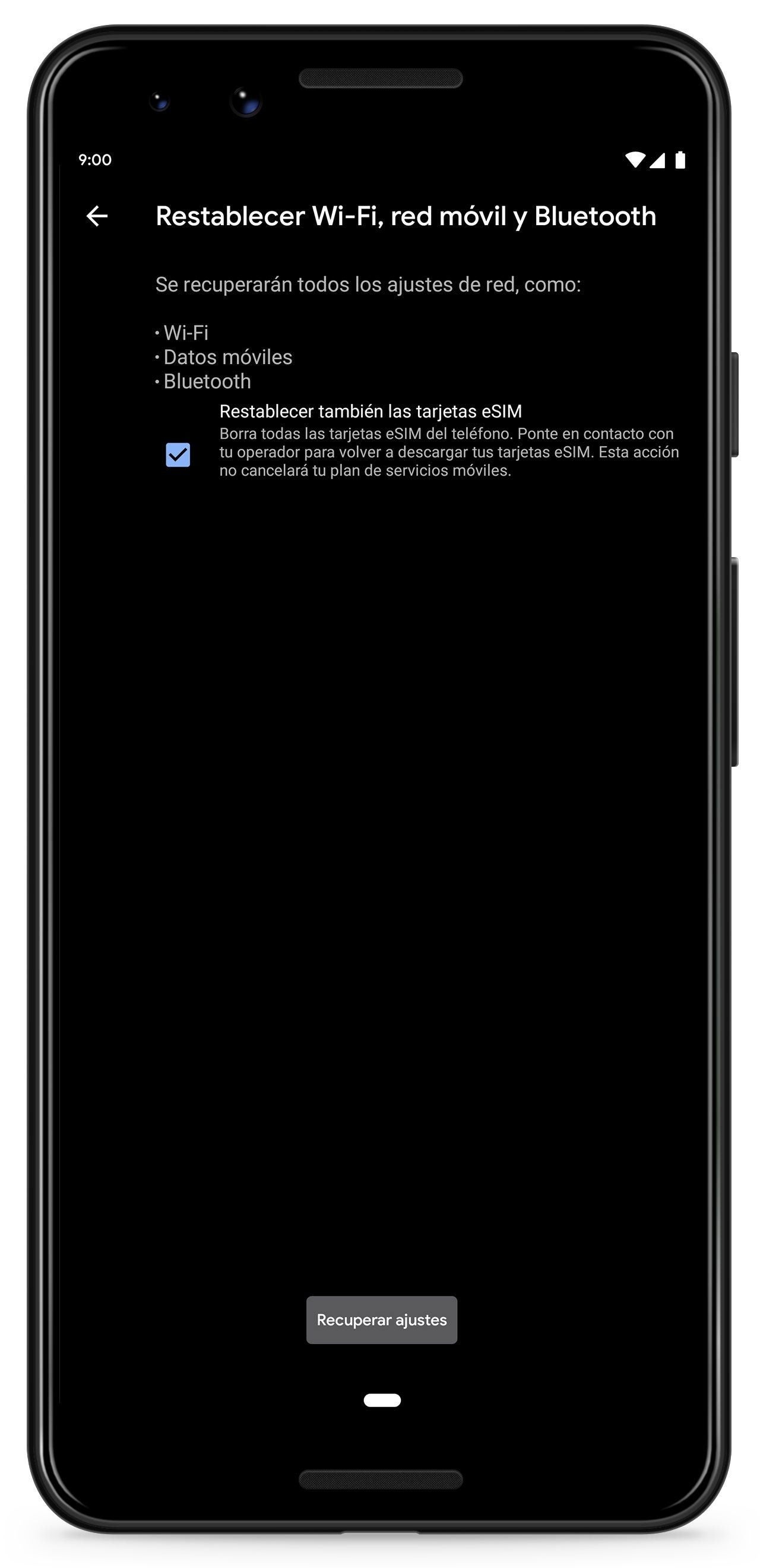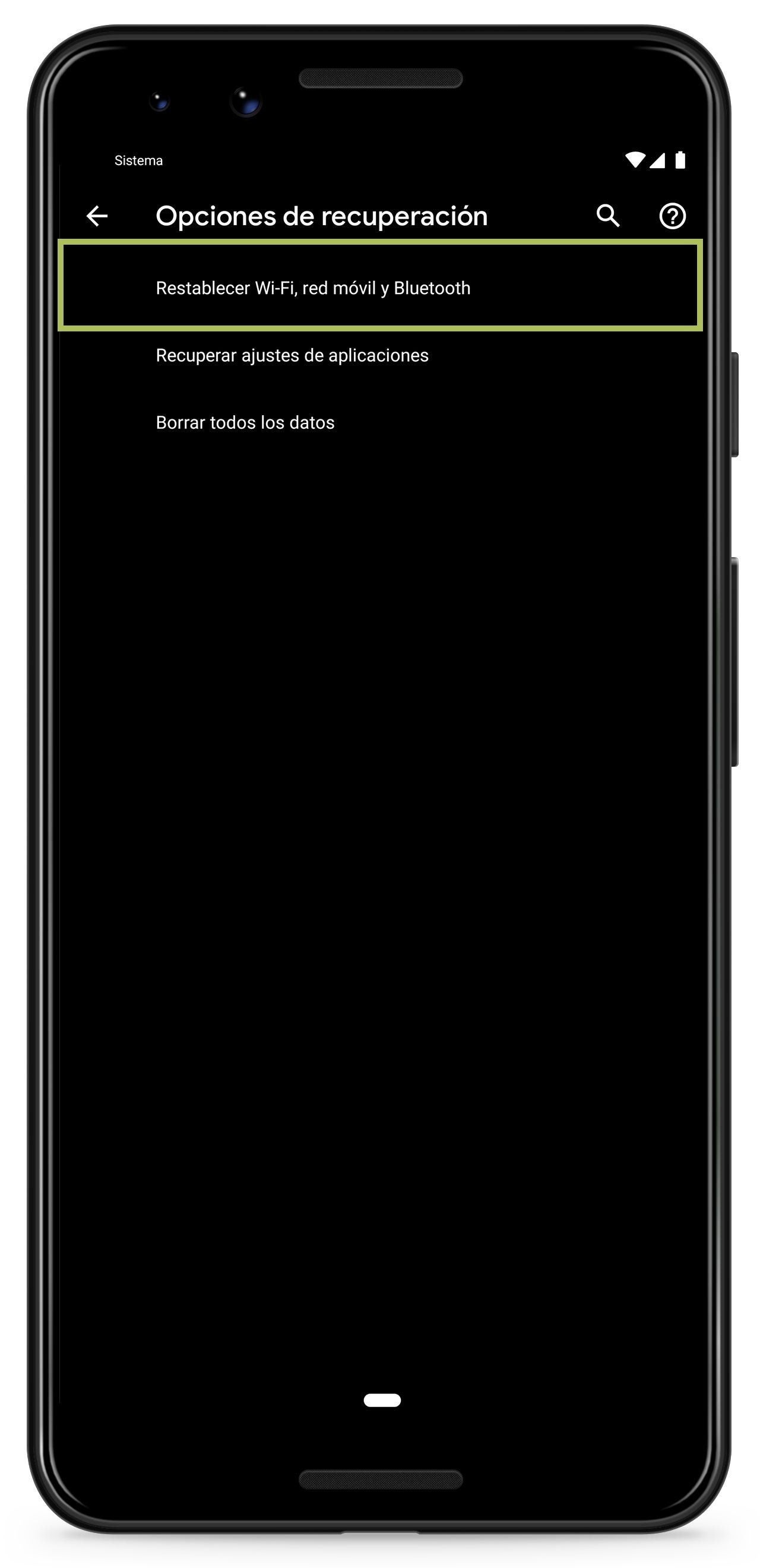 - Seleccionar la opción "Restablecer Wi-Fi, red móvil y Bluetooth" y pulsar sobre el botón "Recuperar ajustes".