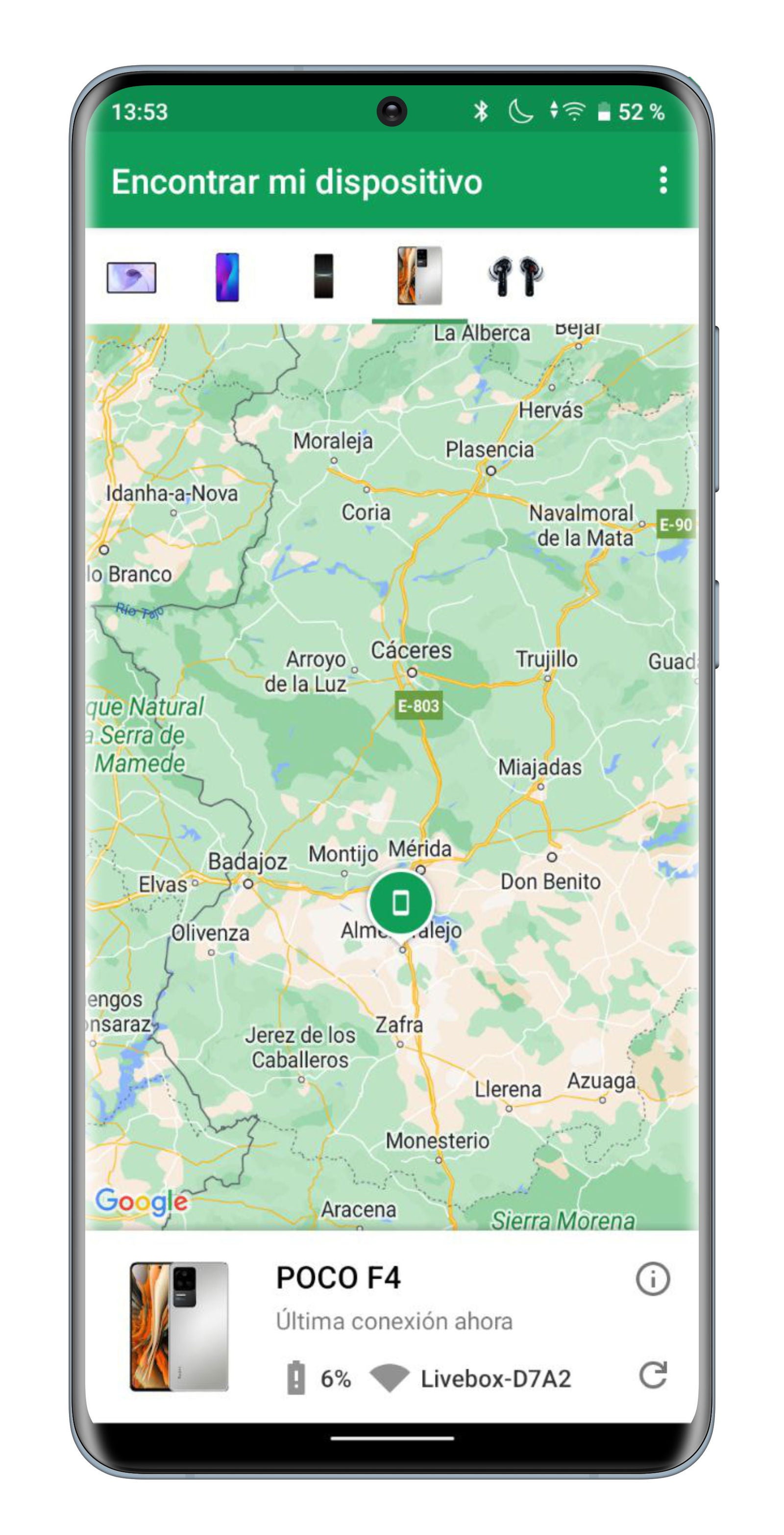 Con esta herramienta de Google también puedes ver la localización aproximada del teléfono. Si la ubicación actual no está disponible, accederás al último punto en el que fue localizado. Como hemos explicado anteriormente, Encontrar mi dispositivo también sirve para la tablet, los auriculares inalámbricos o el reloj inteligente siempre que estén asociados a tu cuenta de Google.