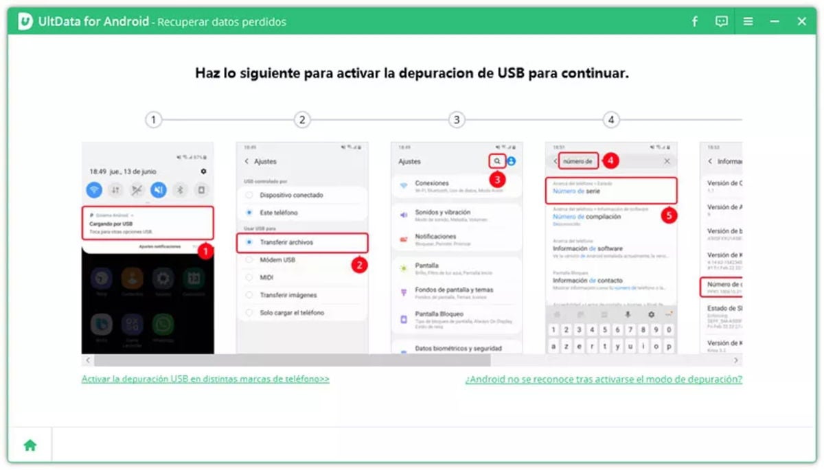 - A continuación, activa la depuración de USB en tu móvil Android (activa primero los ajustes para desarrolladores de tu Android y después, en los propios ajustes para desarrolladores, verás la opción).