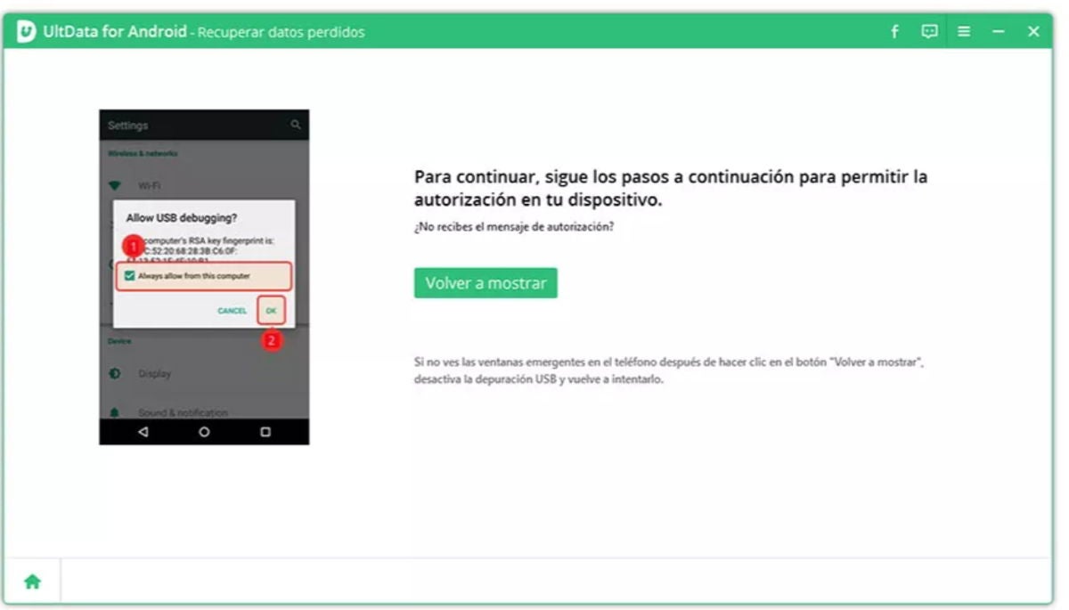 - Autoriza el debugging de UltData en tu Android (simplemente pulsa en "OK").