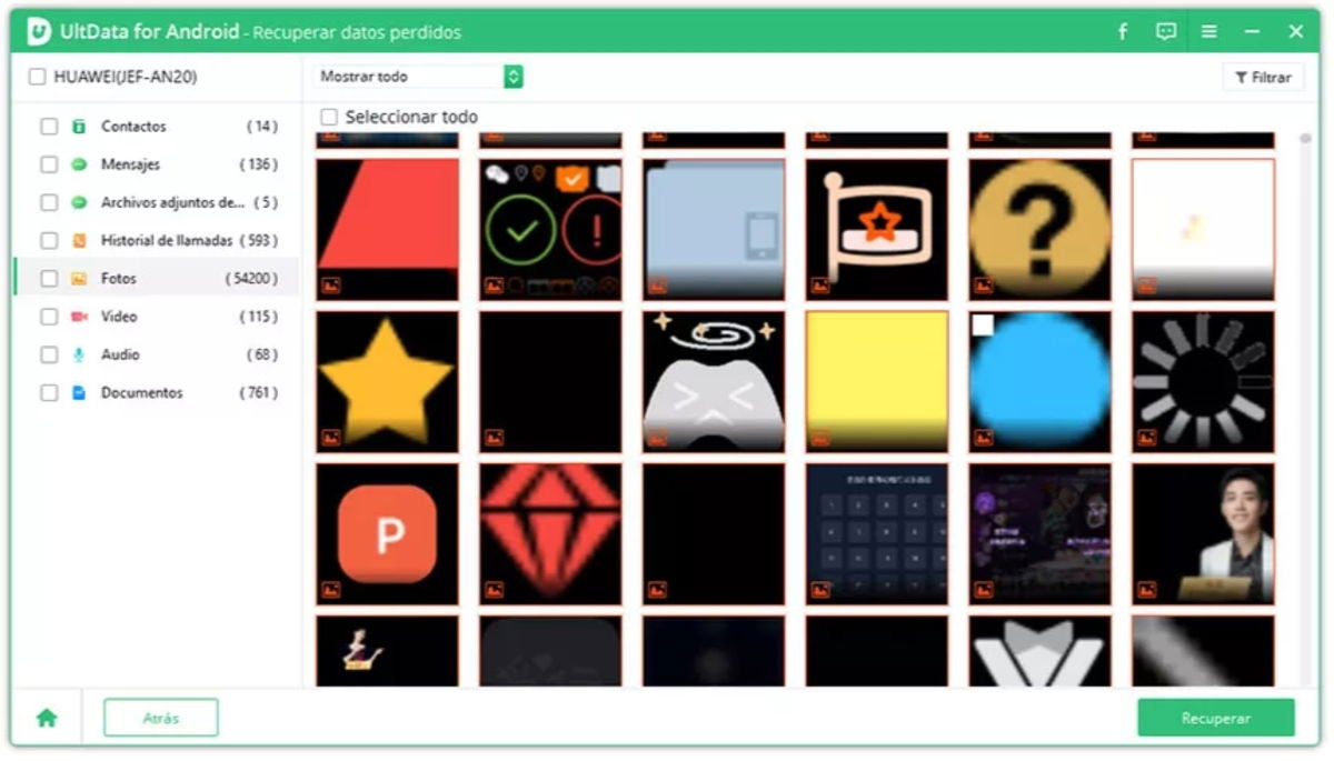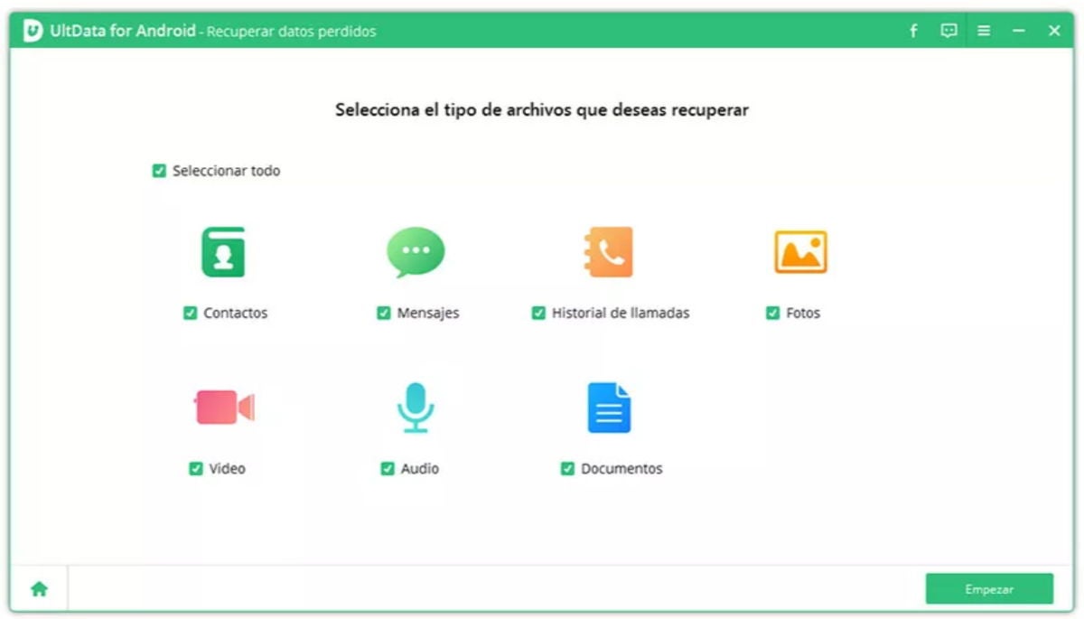 - Con el móvil debidamente conectado al equipo solo tendrás que elegir qué tipo de archivos quieres recuperar. A partir de aquí, UltData para Android comenzará a ejecutar un análisis.