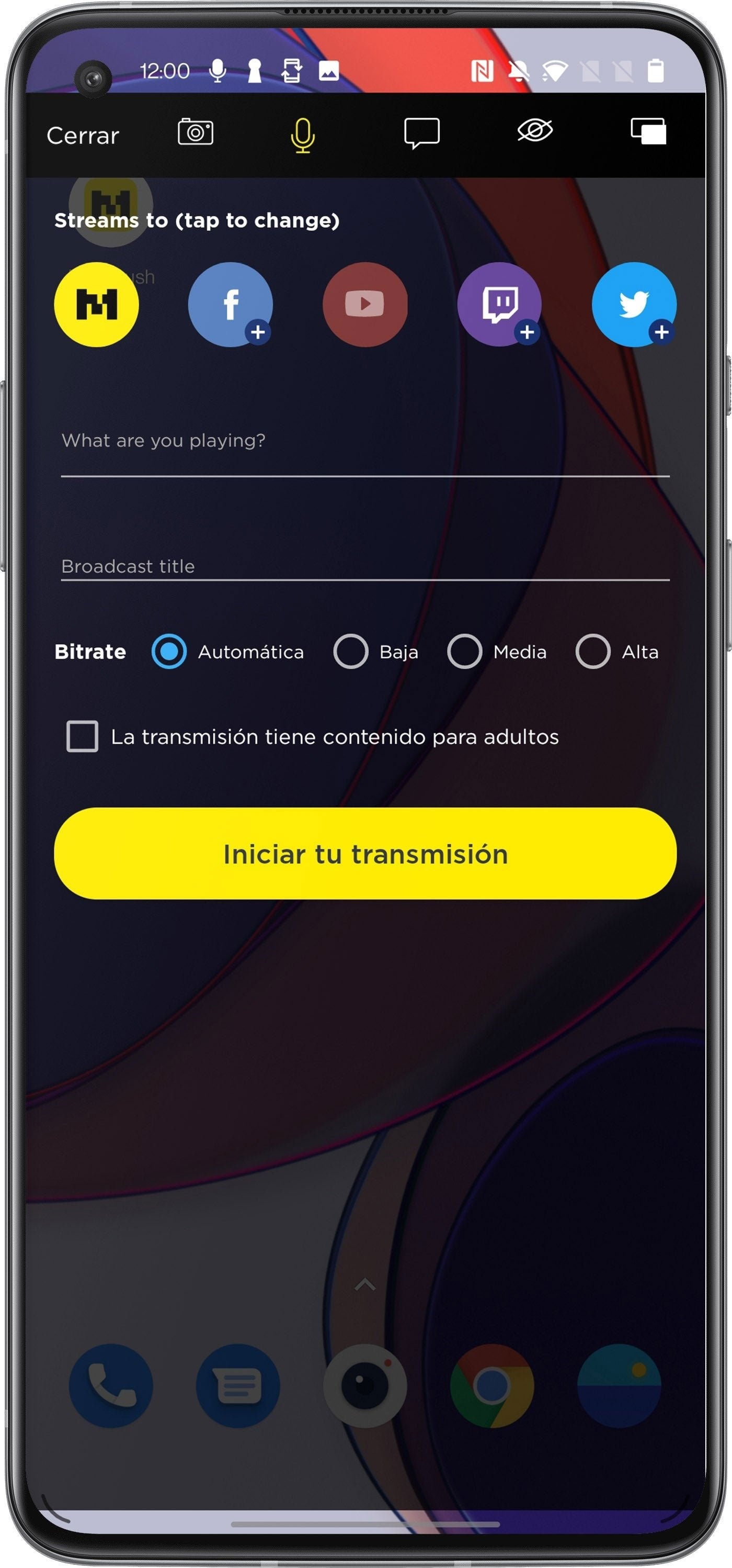 La aplicación también te permite elegir el bitrate de la transmisión, activar o desactivar la cámara o el chat, así como activar un modo privado.