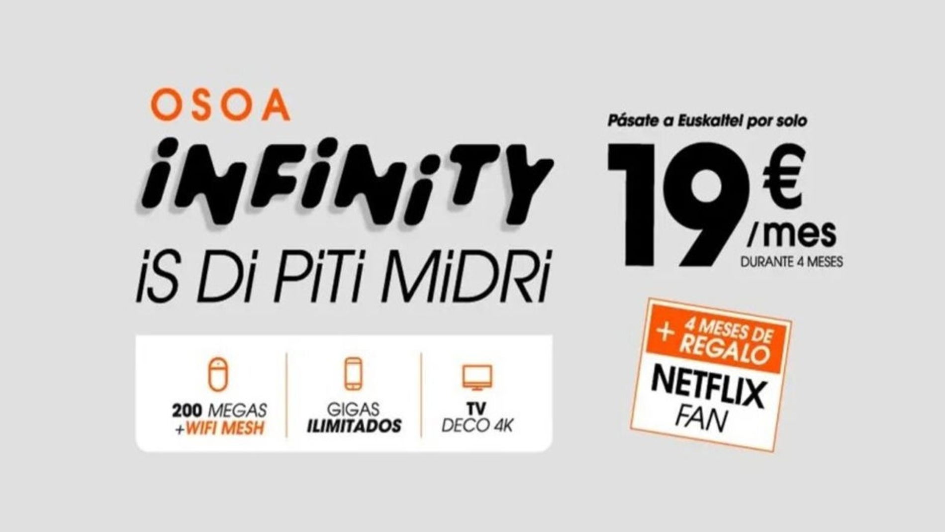 El pack OSOA Infinity Lite incluye línea fija, fibra de 200 megas, una línea móvil con llamadas ilimitadas y datos ilimitados con una velocidad de 2 Mbps, un paquete básico de televisión (Tv Ocio) y Netflix Fan que incluye la suscripción gratuita a Netflix durante 4 meses y 10 GB adicionales por 19 euros al mes durante 4 meses y después 59 euros al mes.