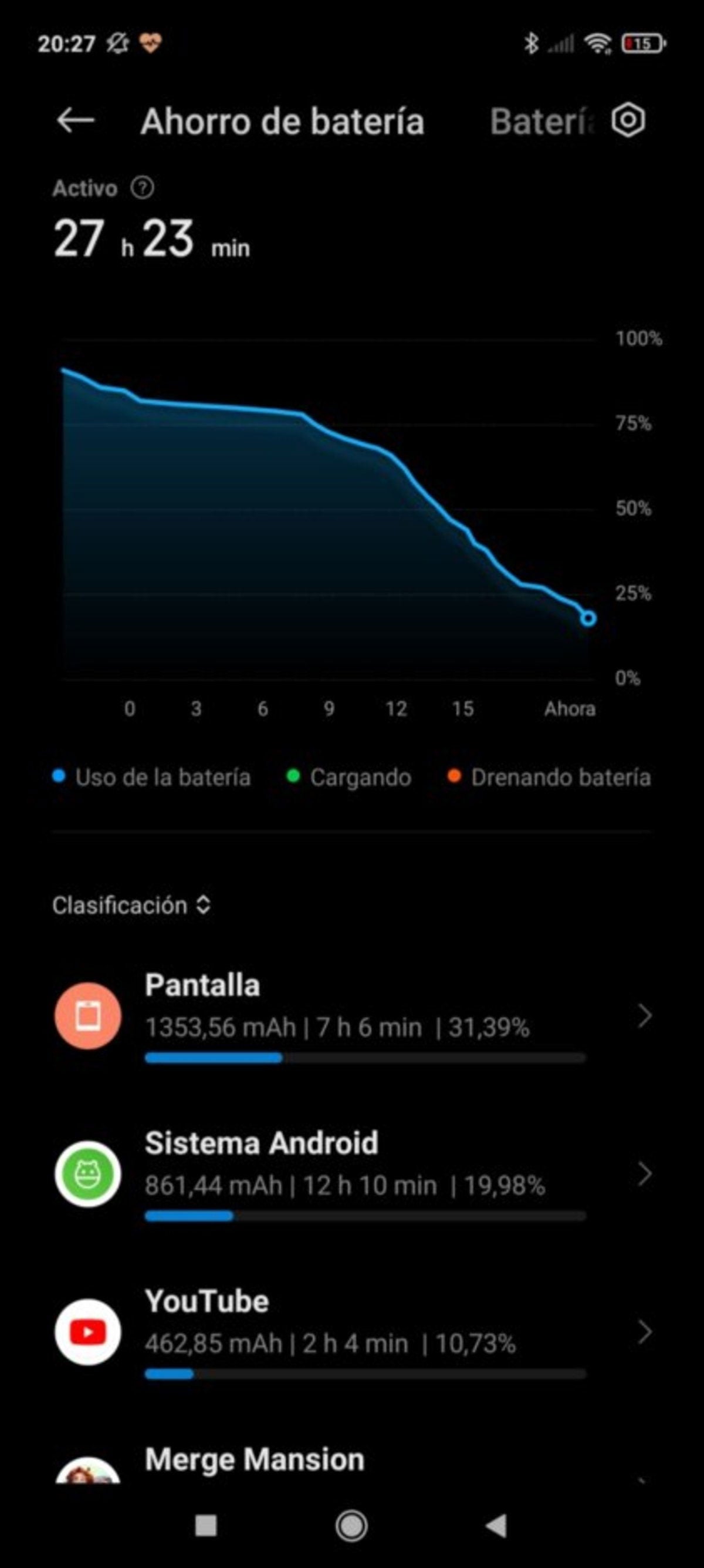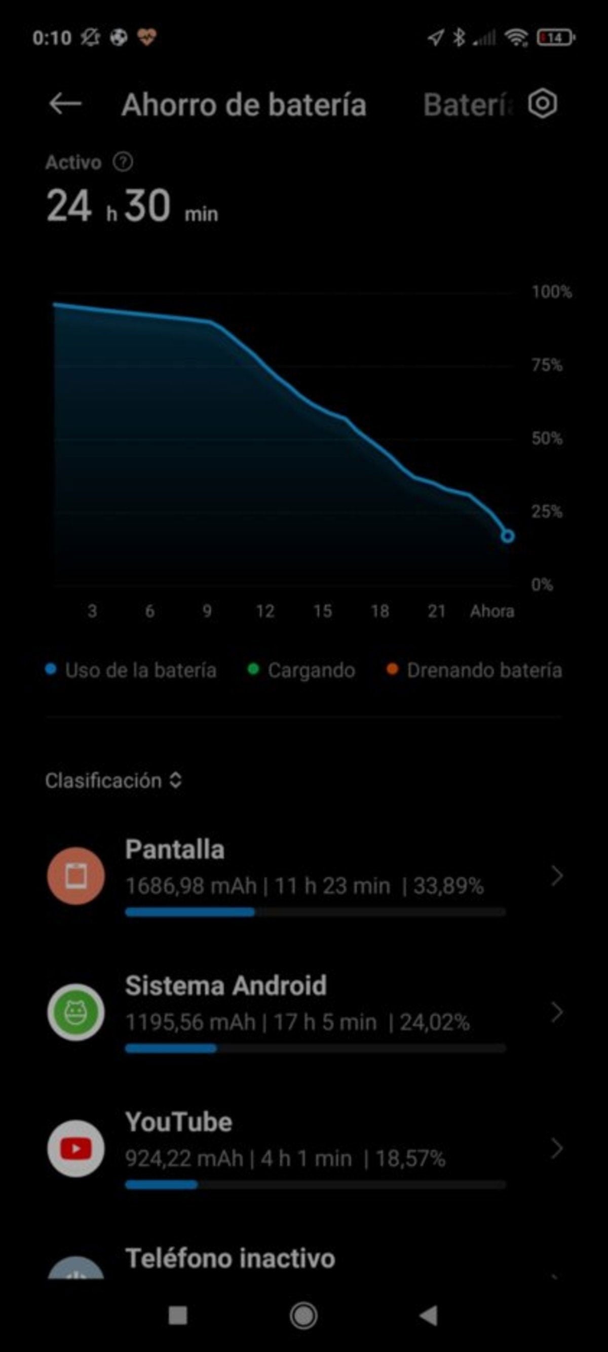 Incluso llevando activados los 90 Hz de su pantalla, su batería de 5.000 mAh nos ha durado un día entero con un uso intensivo llegando al final del mismo con un 15% de batería y 7 horas de pantalla activa. Si bajamos la tasa de refresco a 60 hercios, conseguimos una autonomía de récord: 11 horas y media de pantalla activa en un día de uso intensivo, quedándonos un 14% de batería. Con un uso más moderado, hemos conseguido una duración de dos días de batería con 3 horas de pantalla activa.