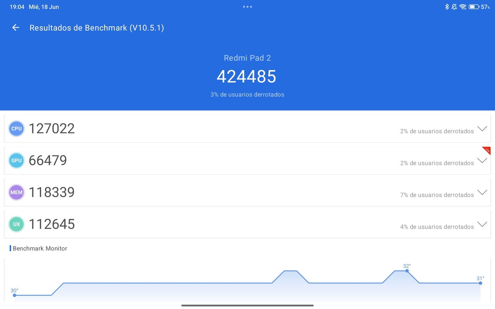 Además, las pruebas sintéticas que hemos realizado no vienen sino a confirmar nuestras sensaciones, ya que al usar la app 3D Mark para aplicarle la prueba "Wild Life", la Redmi Pad consiguió una puntuación de 1.204 puntos y un rango de FPS de 7,21 y al pasarle el benchmark AnTuTu, la Redmi Pad 2 consiguió un total de 424.485 puntos, unas cifras más que aceptables para una tablet de gama de entrada.