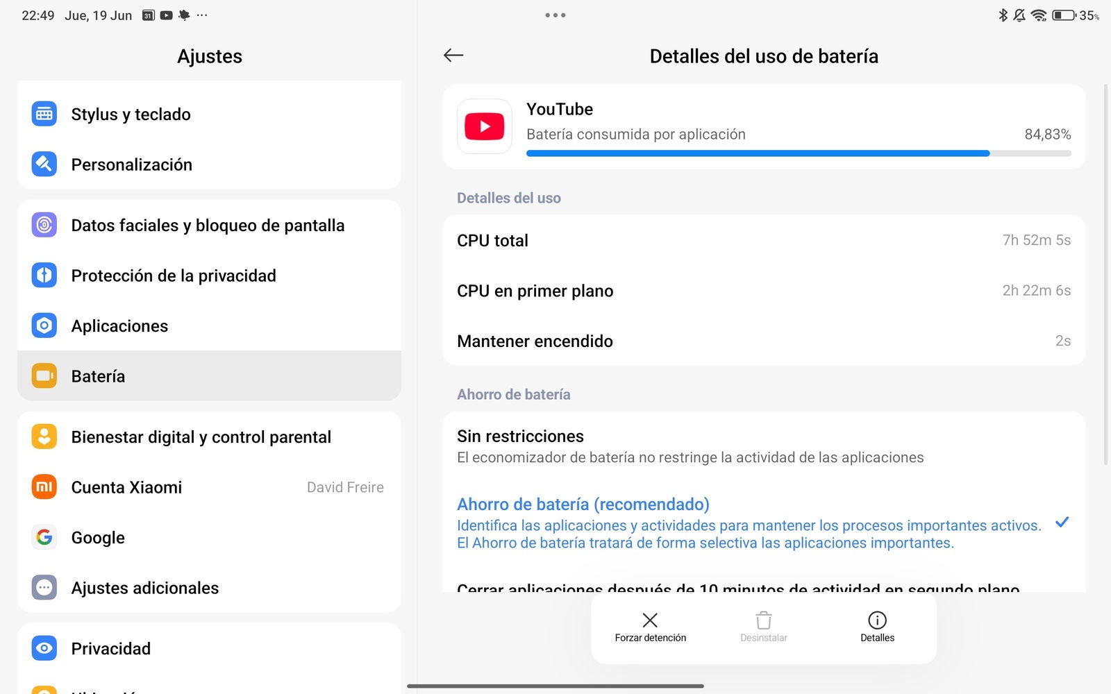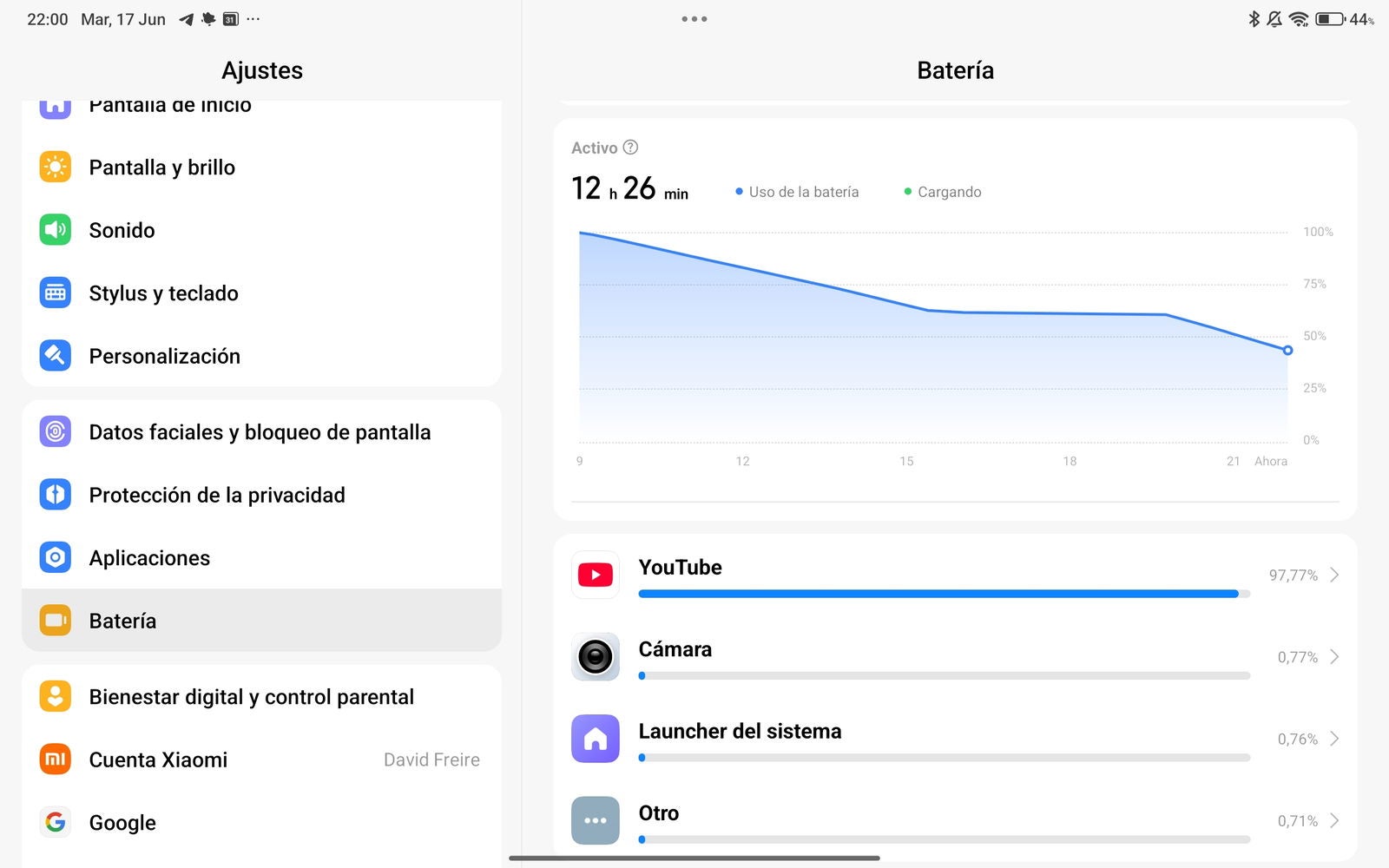 Además, hemos conseguido llegar al final de un día de uso bastante intenso, tirando sobre todo de YouTube, con un 44 % de batería restante y casi 7 horas de pantalla activa.