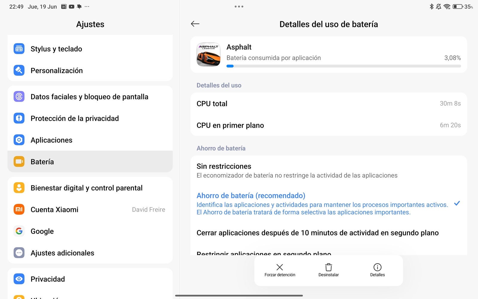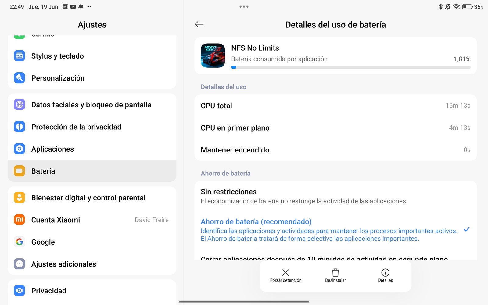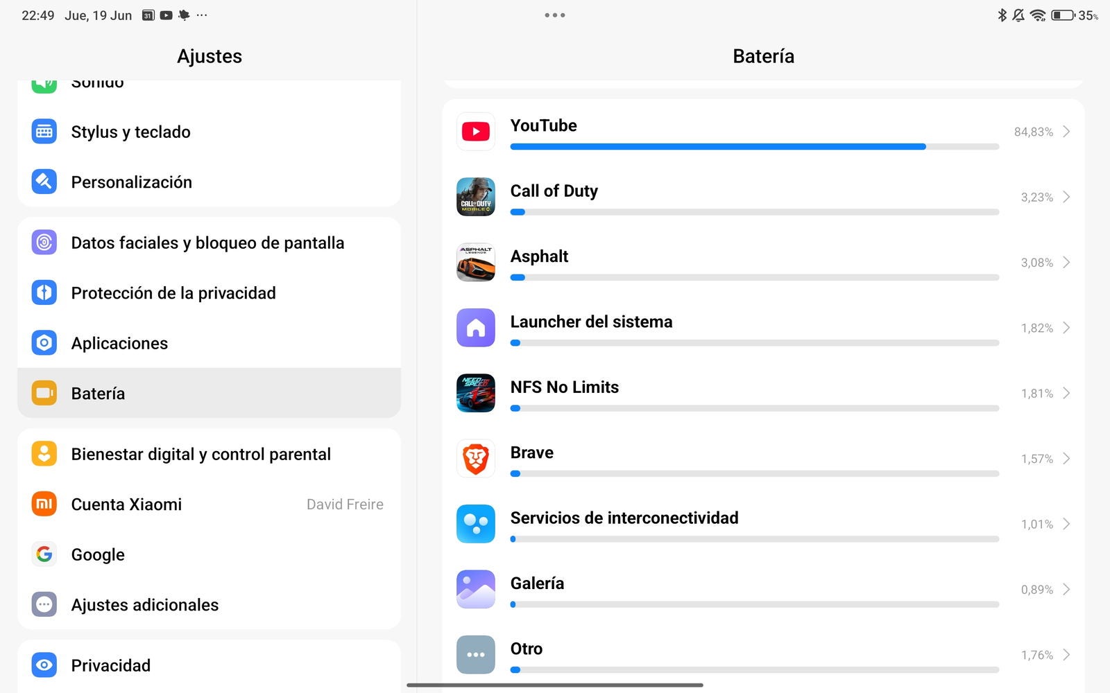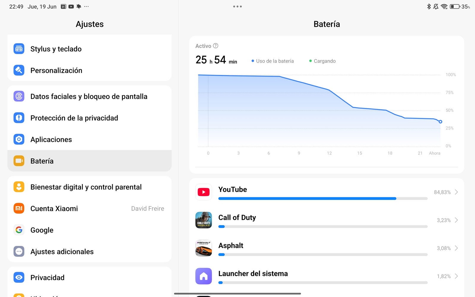 En otra prueba de uso todavía más intensivo que hemos realizado combinando la visualización de los vídeos de YouTube con alguna partida a Asphalt Legends Unite, Call of Duty: Mobile y NFS No Limits llegamos al final del día con un 35 % de batería restante y con más de 9 horas de pantalla activa.