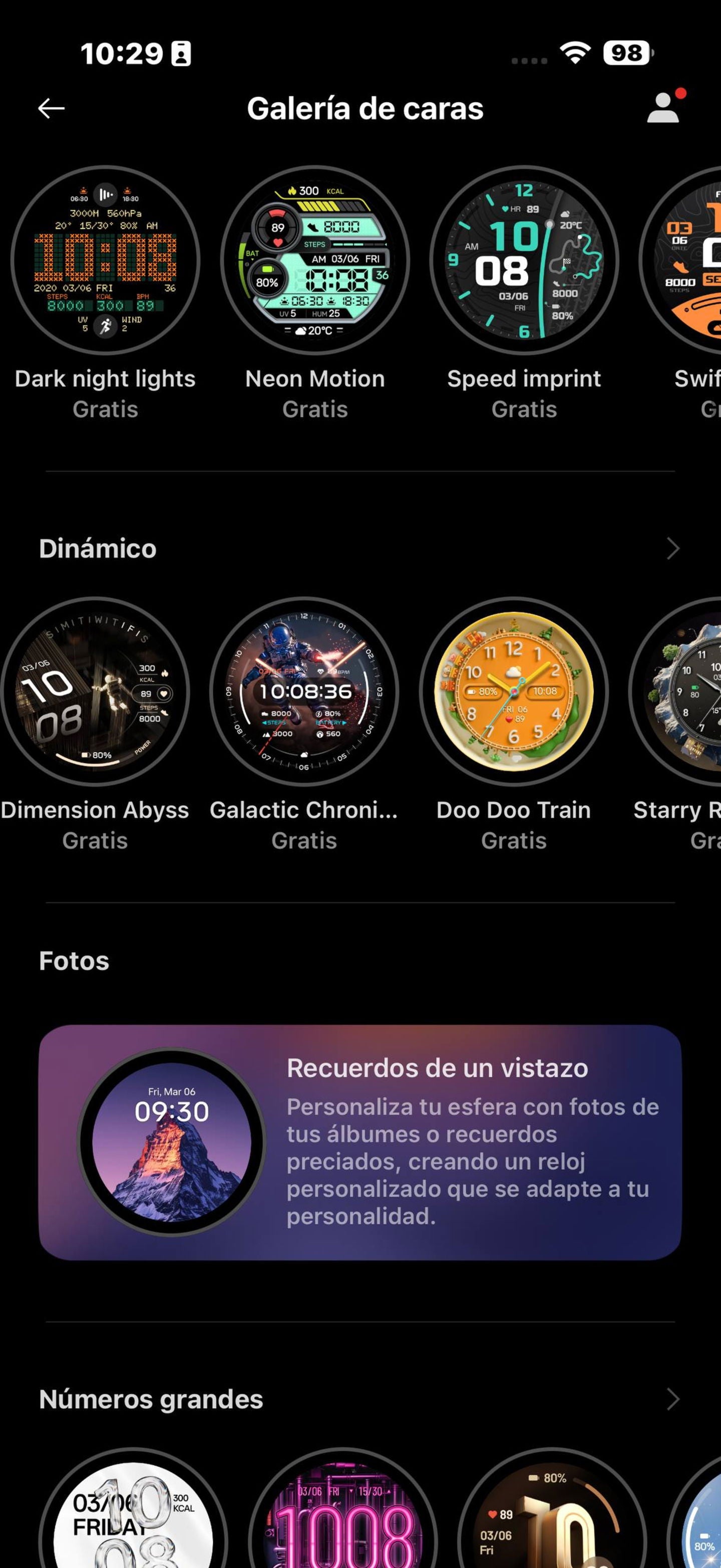 | Funcionalidades destacadas | Sueño (4 fases del sueño), puntuación de descanso y modo descanso Frecuencia cardiaca Actividades diarias 100 modos deportivos 6 tipos de reconocimiento automático: correr, caminar a paso ligero, andar en bicicleta, nadar, máquina de remo y máquina elípctica Monitorización de oxígeno en sangre Ejercicios de respiración Detección de caídas Rastreador de ciclos Temperatura de la muñeca Medición de la salud en 60 segundos Temperatura corporal |