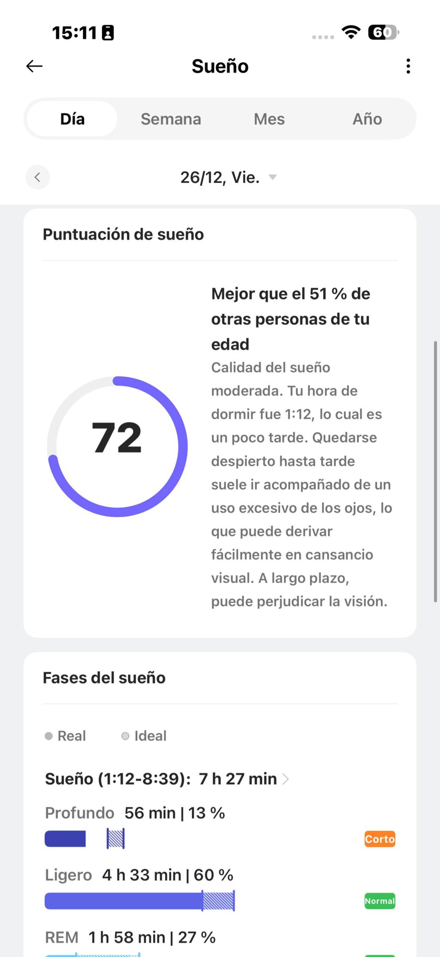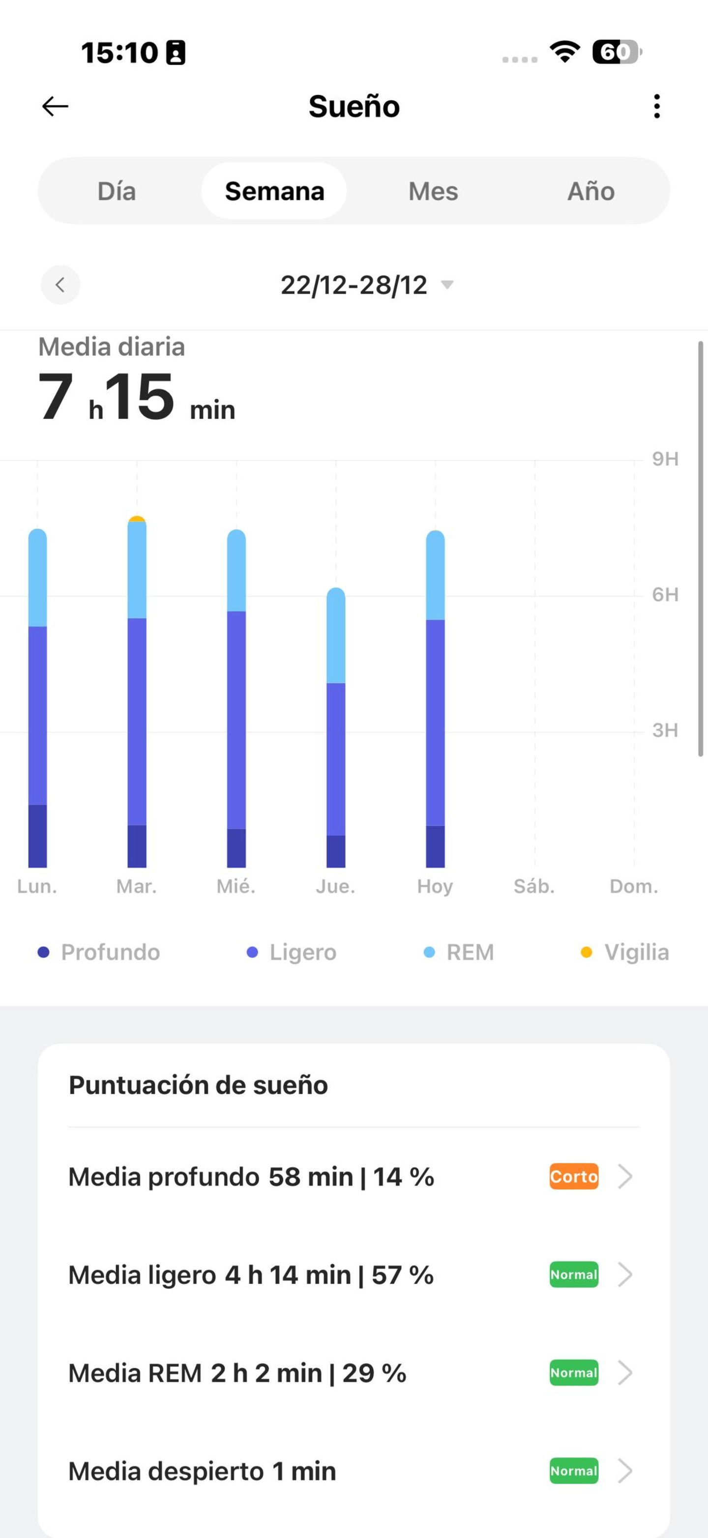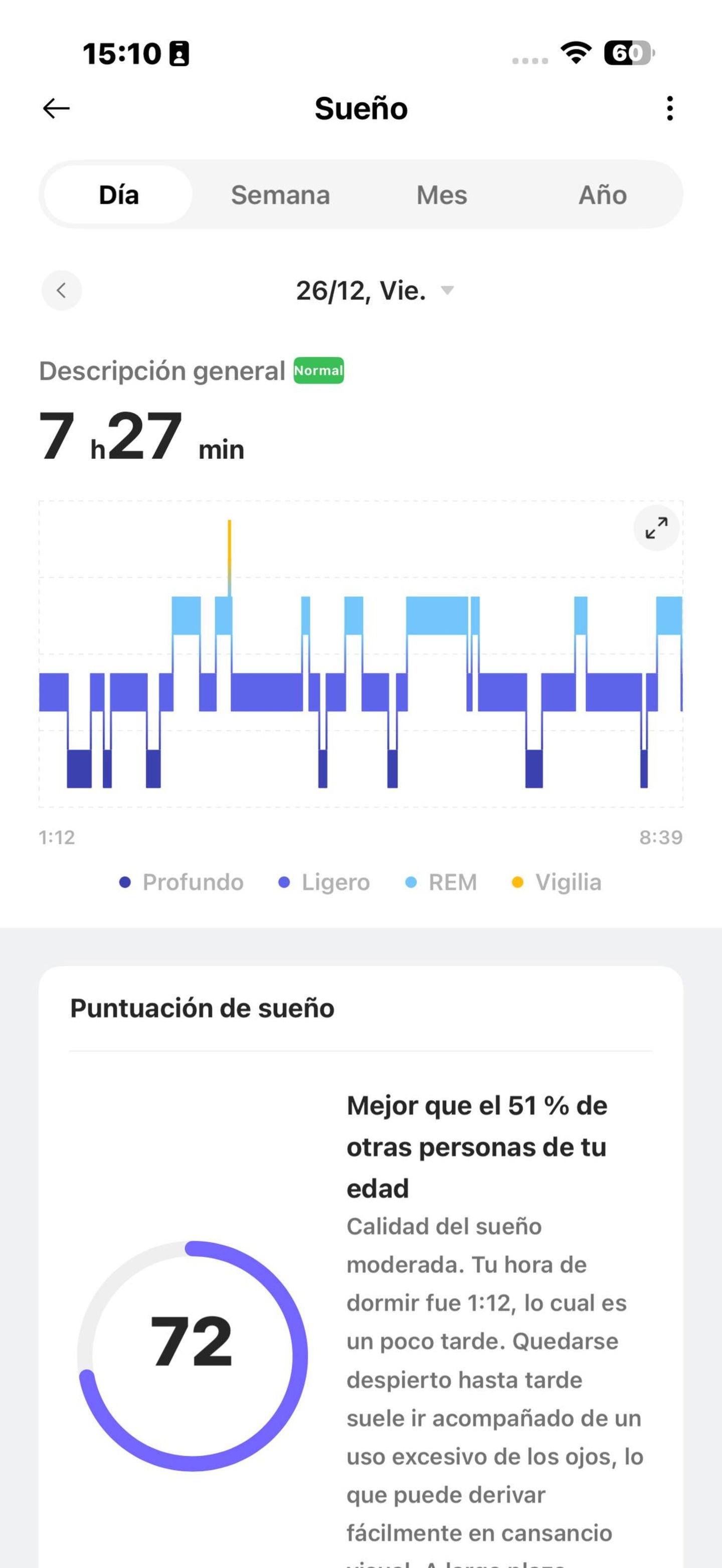 Un aspecto fundamental es el sueño. Es uno de esos relojes que miden el sueño y lo desglosan en sus cuatro distintas fases (sueño ligero, sueño profundo, fase REM y vigilia), indicándote cuánto has estado en cada una. También valora tu sueño, poniéndole nota y mostrándote cómo es en comparación con la gente de tu edad.