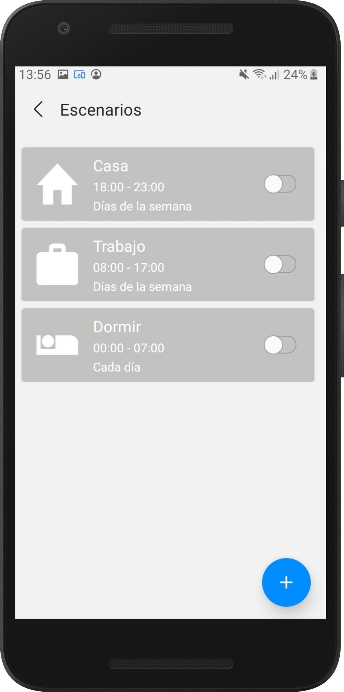 Al abrirla por primera vez, te toparás de lleno con los menús y funciones disponibles. Vayamos una por una para que la compresión sea más sencilla. En primer lugar verás el menú "Escenarios", que te permite configurar diferentes escenarios para que el sonido se ajuste automáticamente dependiendo del momento. Por ejemplo, puedes establecer que se ponga automáticamente en modo vibración cuando estés en el trabajo y el horario exacto de este escenario.