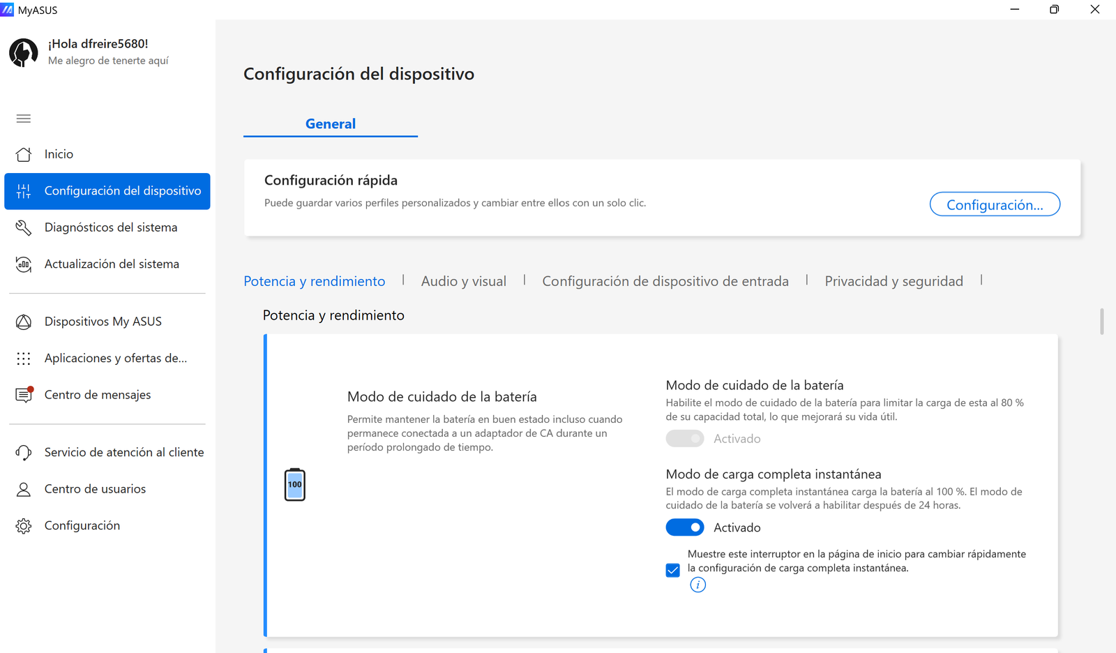 Igual que sucede en el resto de ordenadores de ASUS, usando la app MyASUS vas a poder escoger entre el modo de carga completa instantánea, el cual recarga la batería hasta el 100% de su capacidad, y el modo de cuidado de la batería, el cual limita la carga de la batería al 80 % para preservar la salud de la misma y alargar su vida útil. Este último es el modo ideal si sueles tener conectado el portátil a la corriente durante largos periodos de tiempo.
