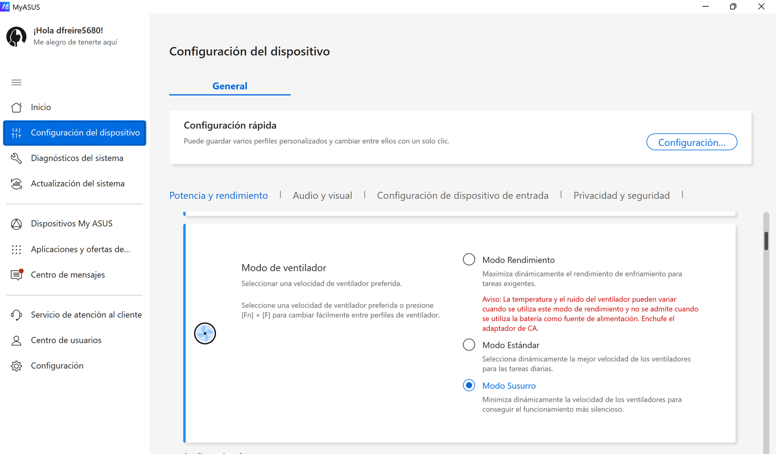 Asimismo, desde esta app también vas a poder configurar diferentes parámetros del portátil como el tipo de carga de la batería, la velocidad del ventilador o la cancelación de ruido de los micrófonos y ejecutar un diagnóstico de los principales elementos del hardware del PC como el Wi-Fi, el Bluetooth, la memoria RAM, el disco duro, el ventilador o la batería.