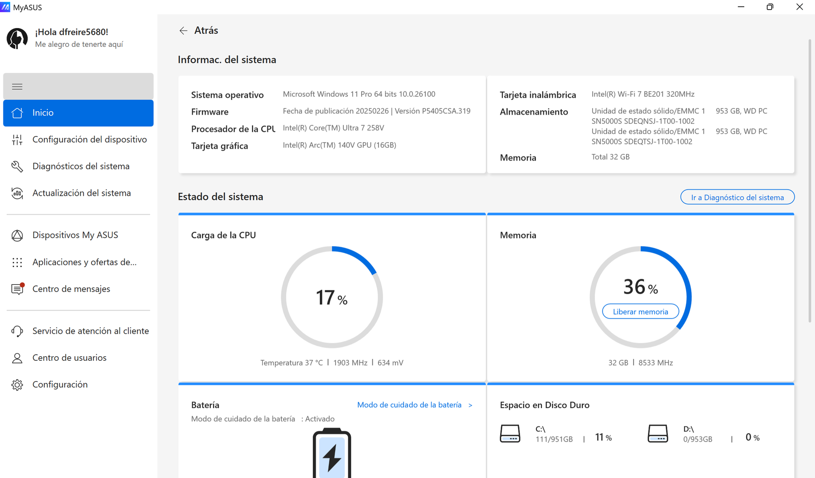 Centrándonos en las aplicaciones propias de ASUS, la primera y más destacada de ellas es MyASUS, un práctico centro de control que te permitirá ver la información más destacada del portátil como, por ejemplo, el estado de la batería, la carga de la CPU y de la memoria RAM o el espacio que te queda libre en el disco duro.